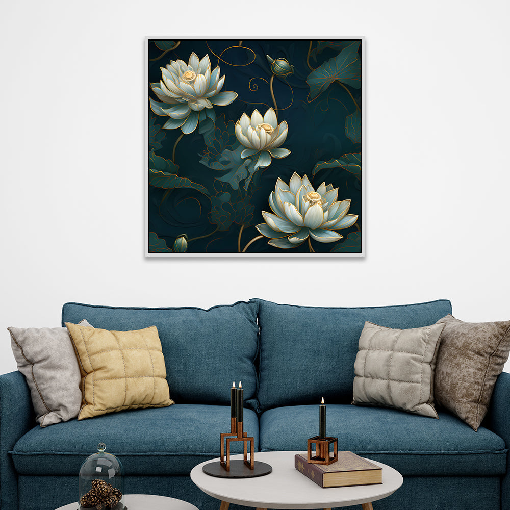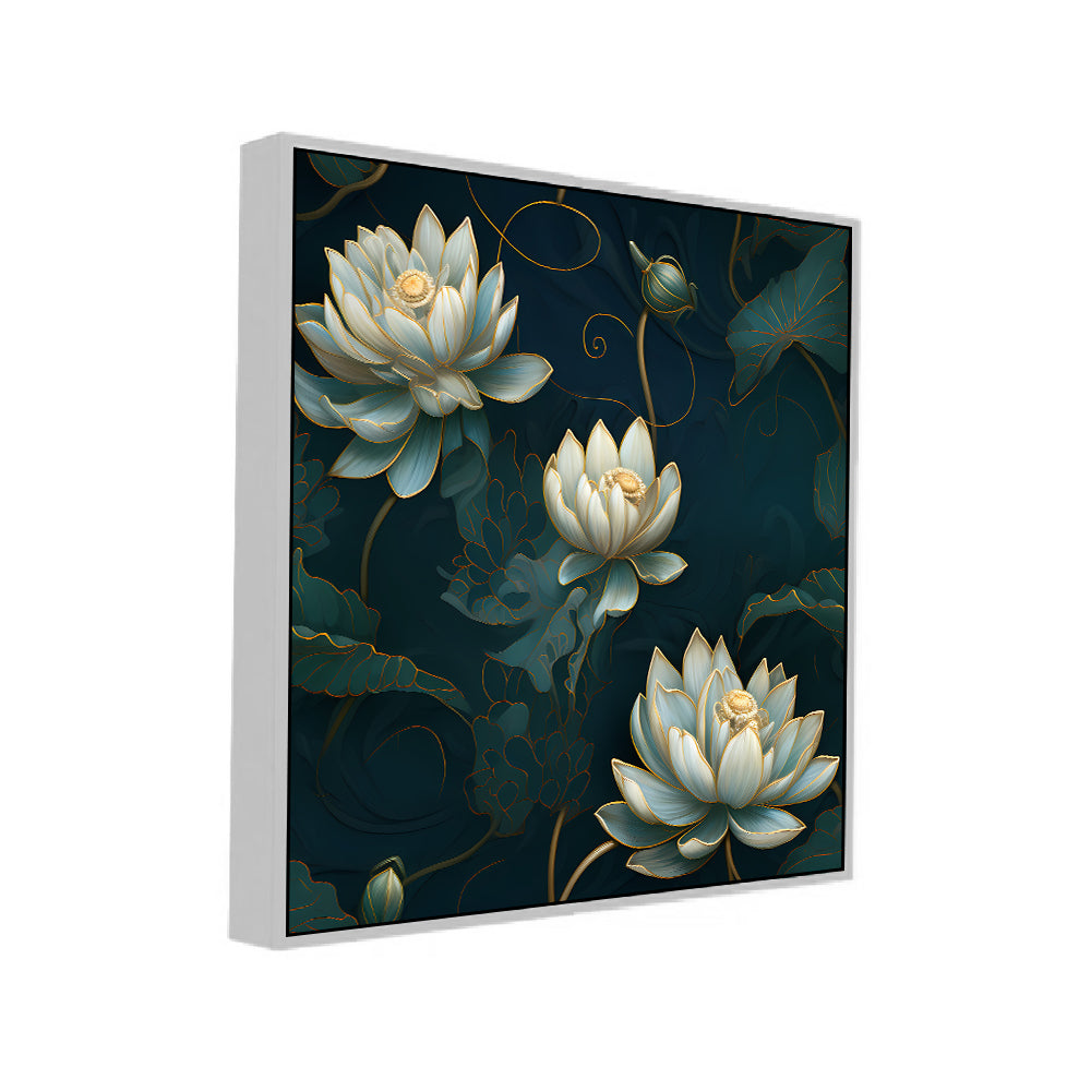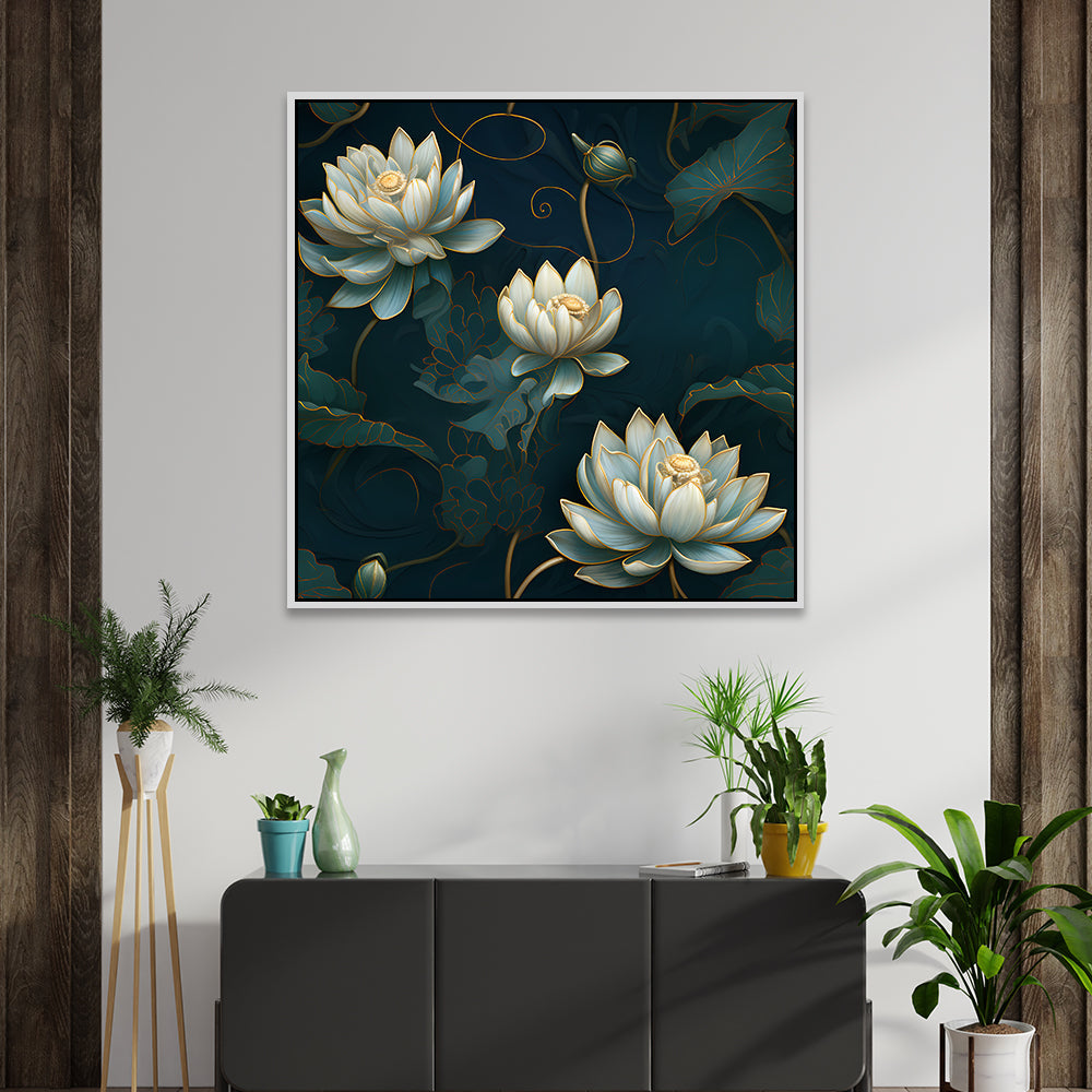 3D Embossed White & Gold Lotus Canvas Floral Vastu Wall Painting