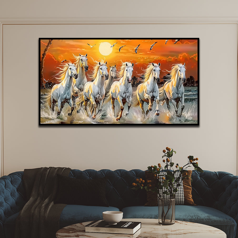 7 Running Horses at Sunrise Vastu Canvas Wall Painting with Floating Frame