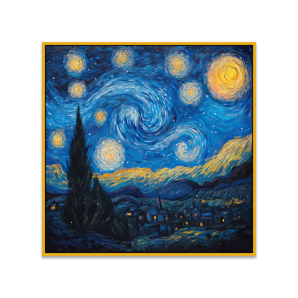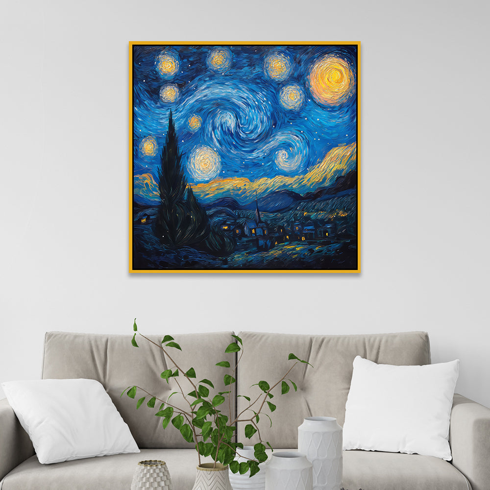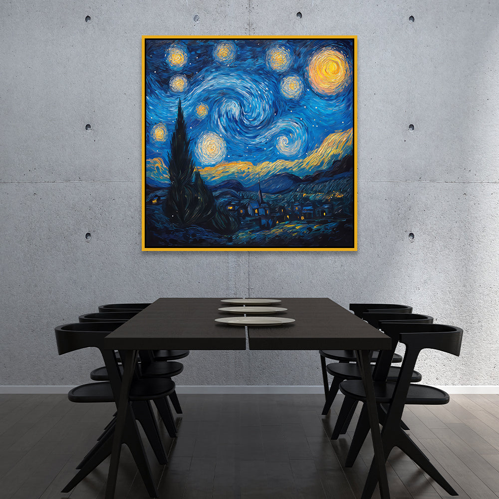 Abstract Wall Painting of Swirling Night Sky Filled with Stars and Bright Moon Over a Village