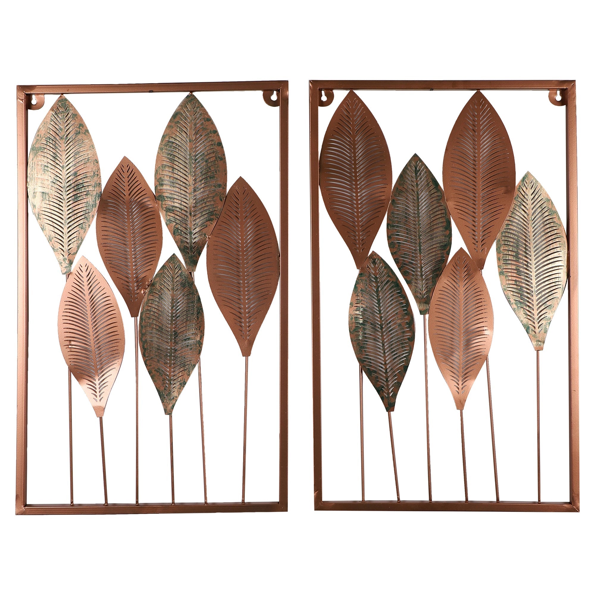Rectangular Copper & Green Etching Leaves Wall Decor Set of 2