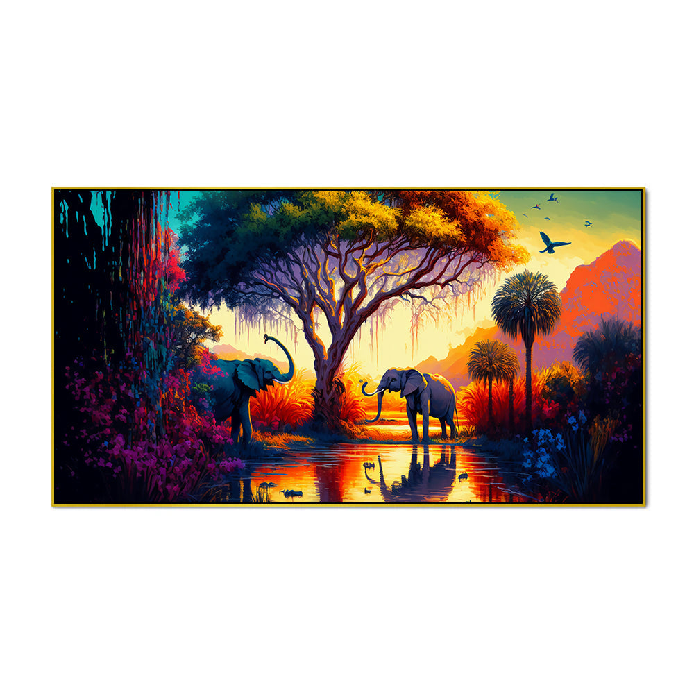 African Elephant in Tropical Jungle Floating Frame Canvas Wall Painting