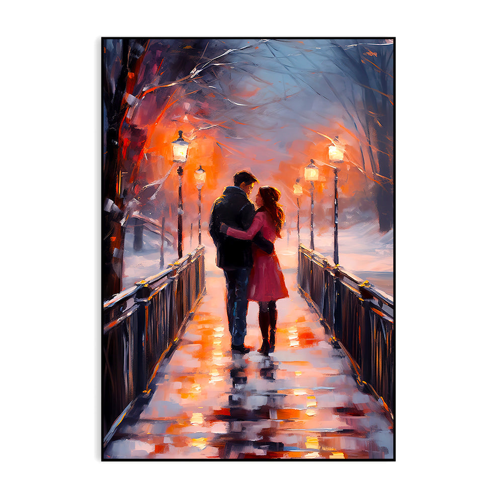 Beautiful A Couple Walking on A Bridge in The Snow Loving Wall Paintings & Arts