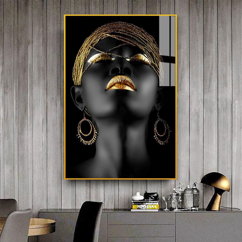 Beautiful Black and Gold African Woman Fantastic Make Up Face Acrylic Wall Paintings