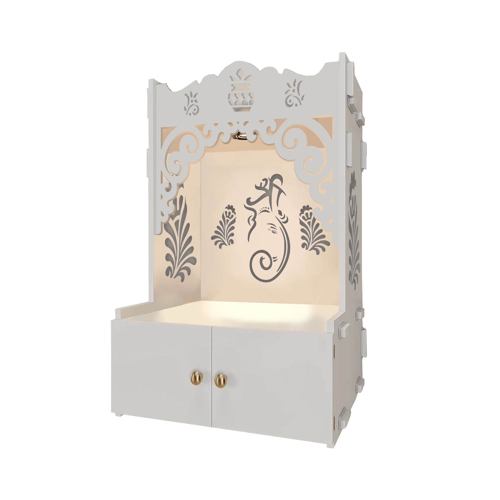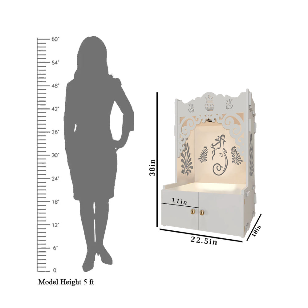 Beautiful Design of Shri Ganesh Floor Temple with Spacious Wooden Shelf & Inbuilt Focus Light- White Finish