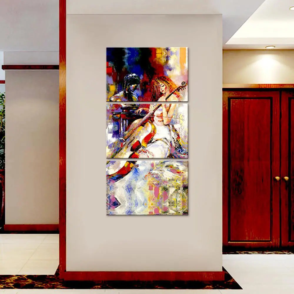Beautiful Girl Playing Violin Wall Painting Wooden Framed 3 Pieces Canvas Painting