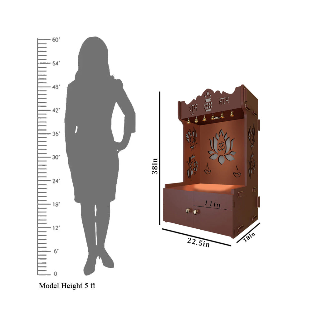 Beautiful Lotus Pattern Floor Temple with Spacious Wooden Shelf & Inbuilt Focus Light- Brown Finish