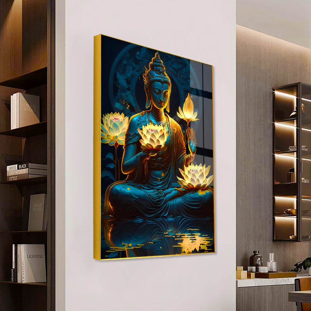 Beautiful Meditation Gautam Buddha Lotus Flower in Hand Acrylic Wall Paintings & Arts
