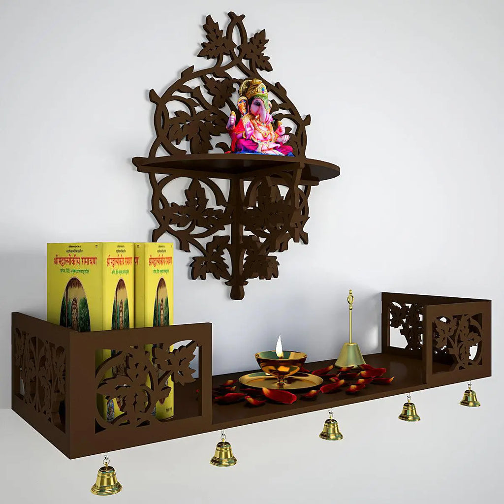 Beautiful Wall Hanging Wooden Temple/ Pooja Mandir Design with Shelf, Brown Color