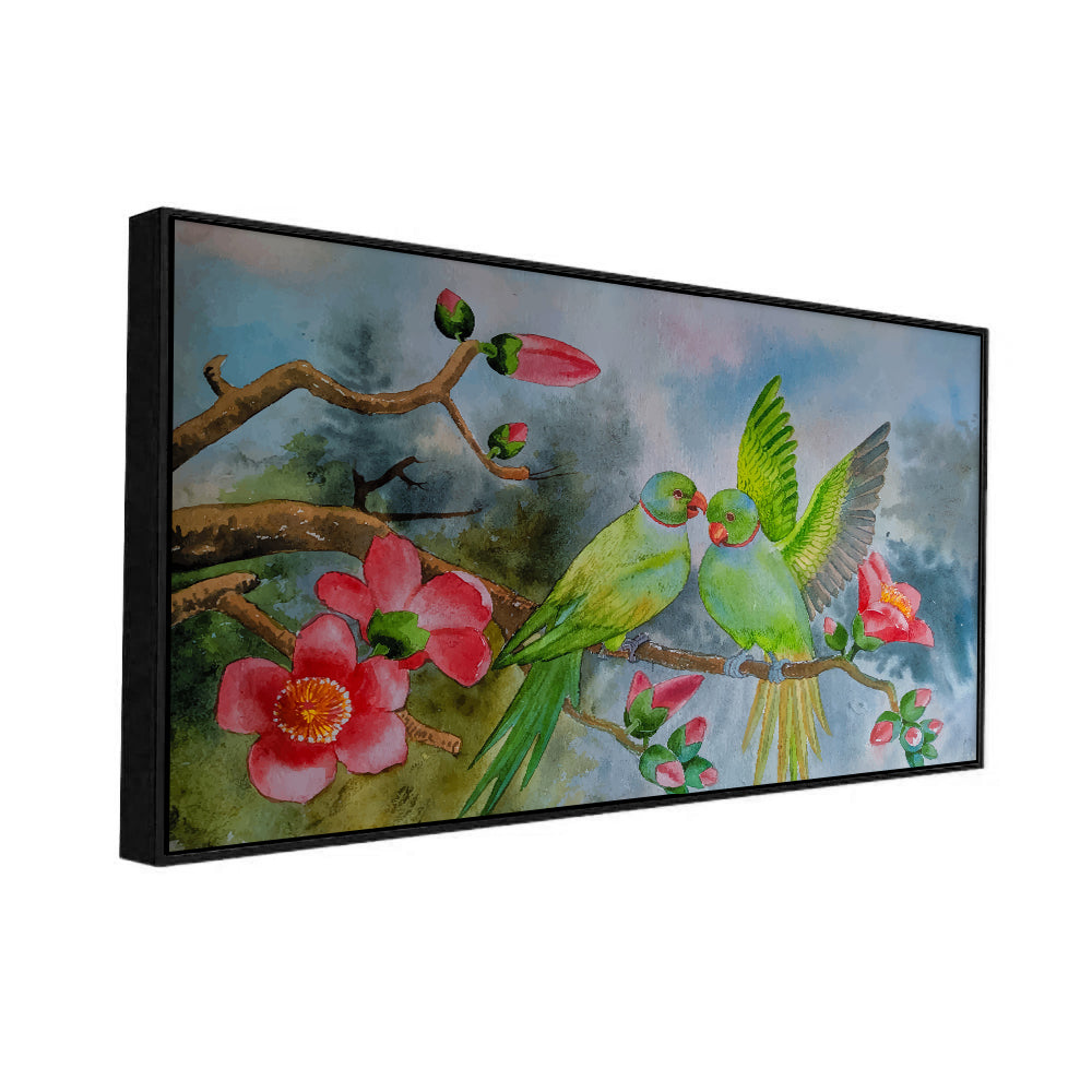 Beautiful Wall Painting of Cute Parrot Couple Sitting on Floral Branch