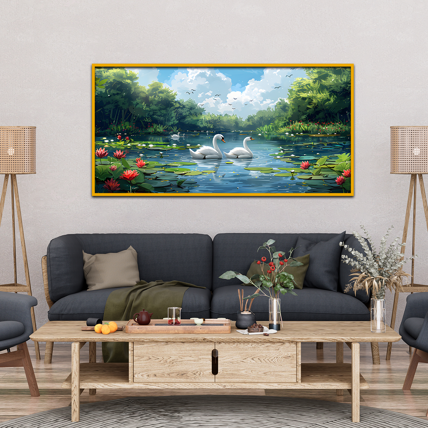 Beautifull Realistic Swan Birds Quaint Cartoon Pond with Jumping Frogs Canvas Wall Paintings