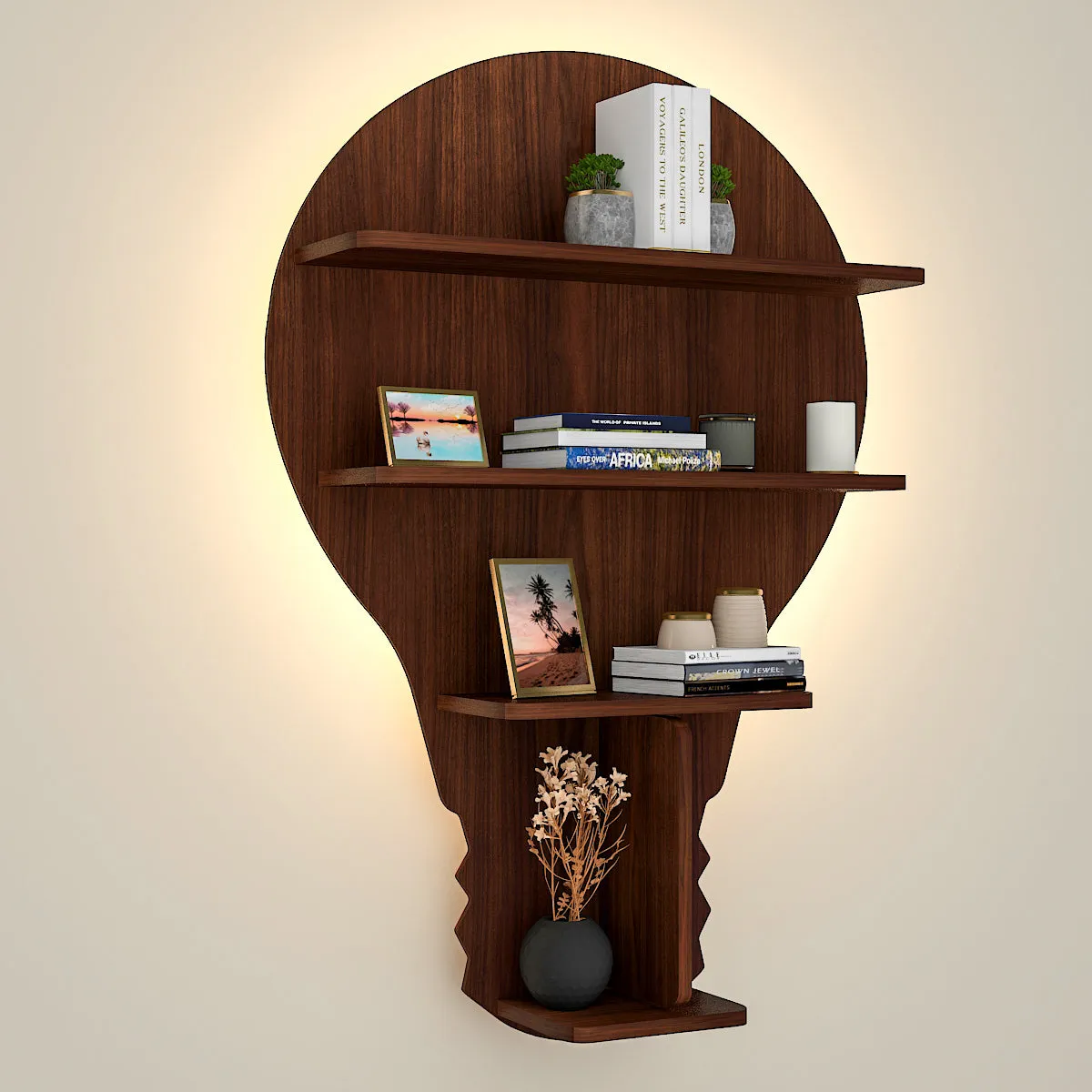 Bulb Shape Backlit Wood Wall Shelf / Book Shelf / Night Light, Walnut Finish