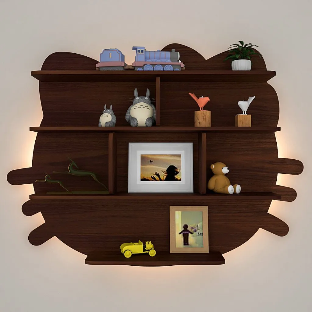 Cat Shape Backlit Wood Wall Shelf / Book Shelf / Night Light, Walnut Finish