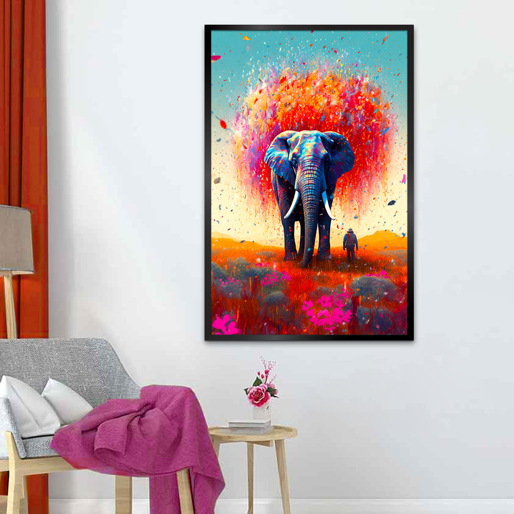 Colorful Big Elephant with a Man Walking Canvas Printed Wall Paintings & Arts