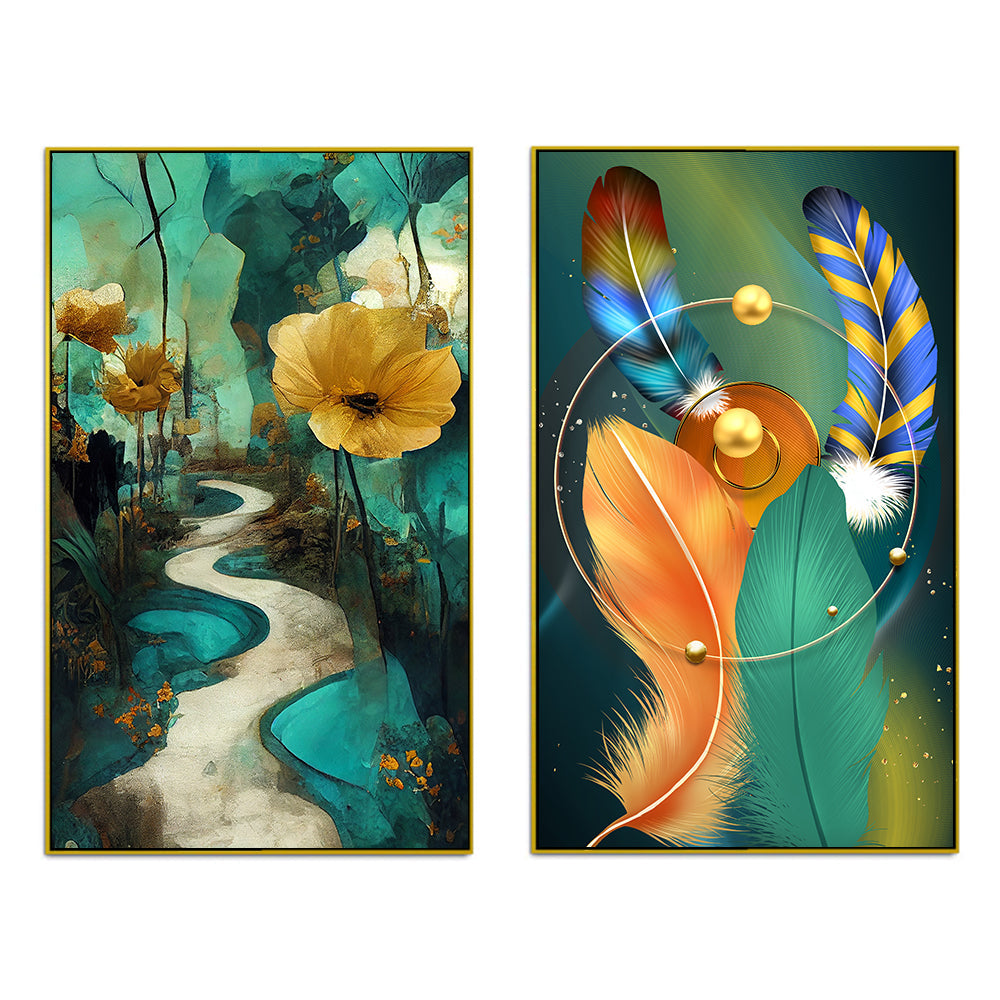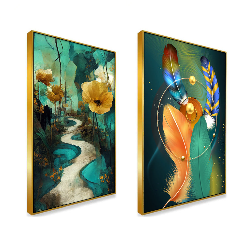 Contemporary Golden Floral Canvas Wall Painting Two Pieces