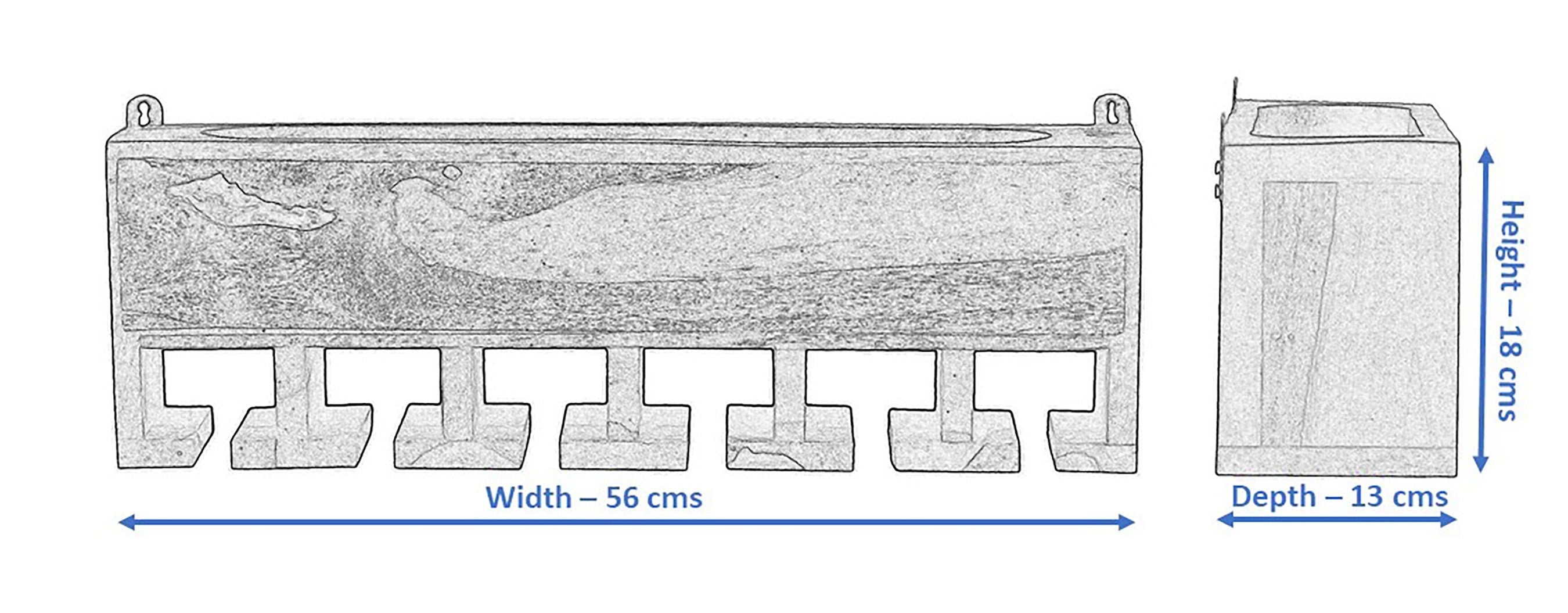 | Size: Width - 57 cms, Depth - 13 cms, Height - 18 cms | Please refer to the size image for more details | Capacity: It can store 6 wine glasses in inverted vertical position. | Material: Made of premium quality solid wood for sturdiness and unique wood texture | Finish type: Matt finish | Ideal Mini Bar Cabinet, suitable for vases, show pieces and planters etc.