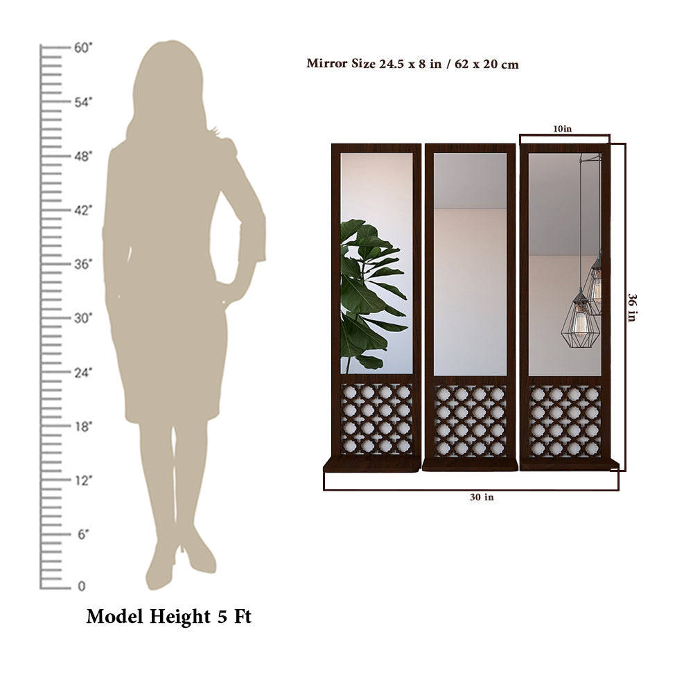 | Product Dimensions- Height 36 inch X Width 30 inch | Framework made of tough mdf wood | High quality "Saint Gobain" or Modicare Glass for clear view | Package contains: 3 pieces of mirror | Care: Wipe with damp, clean cloth | Proudly Made in India