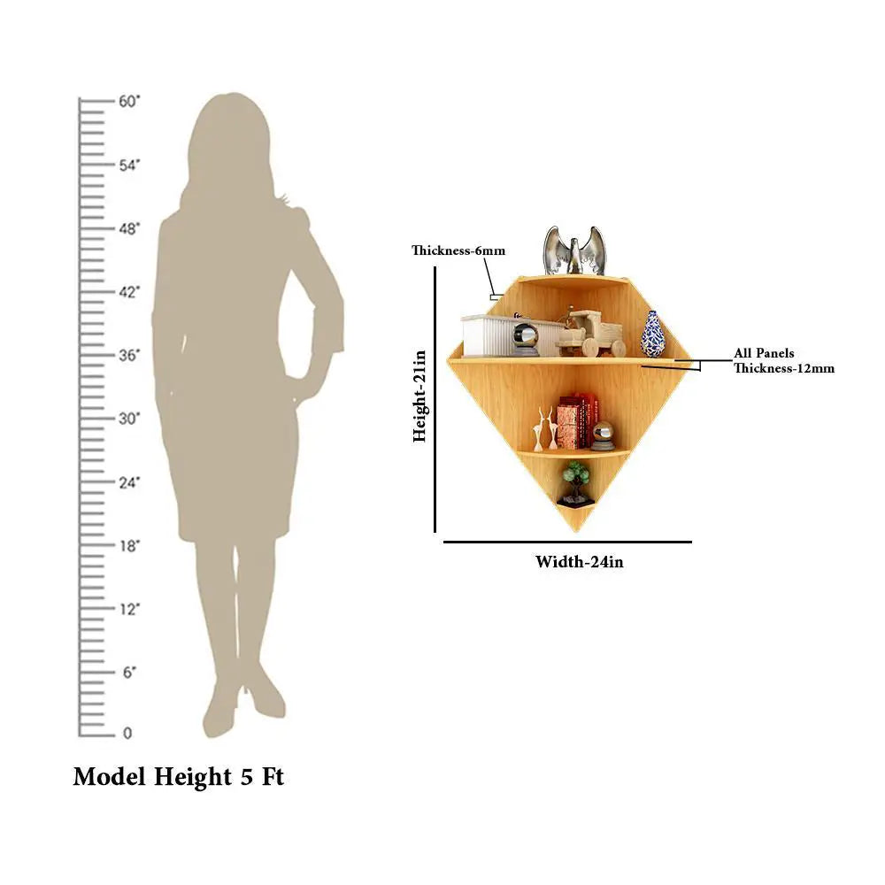 Diamond Shape Wood Corner Wall Shelf / Book Shelf, Oak Finish
