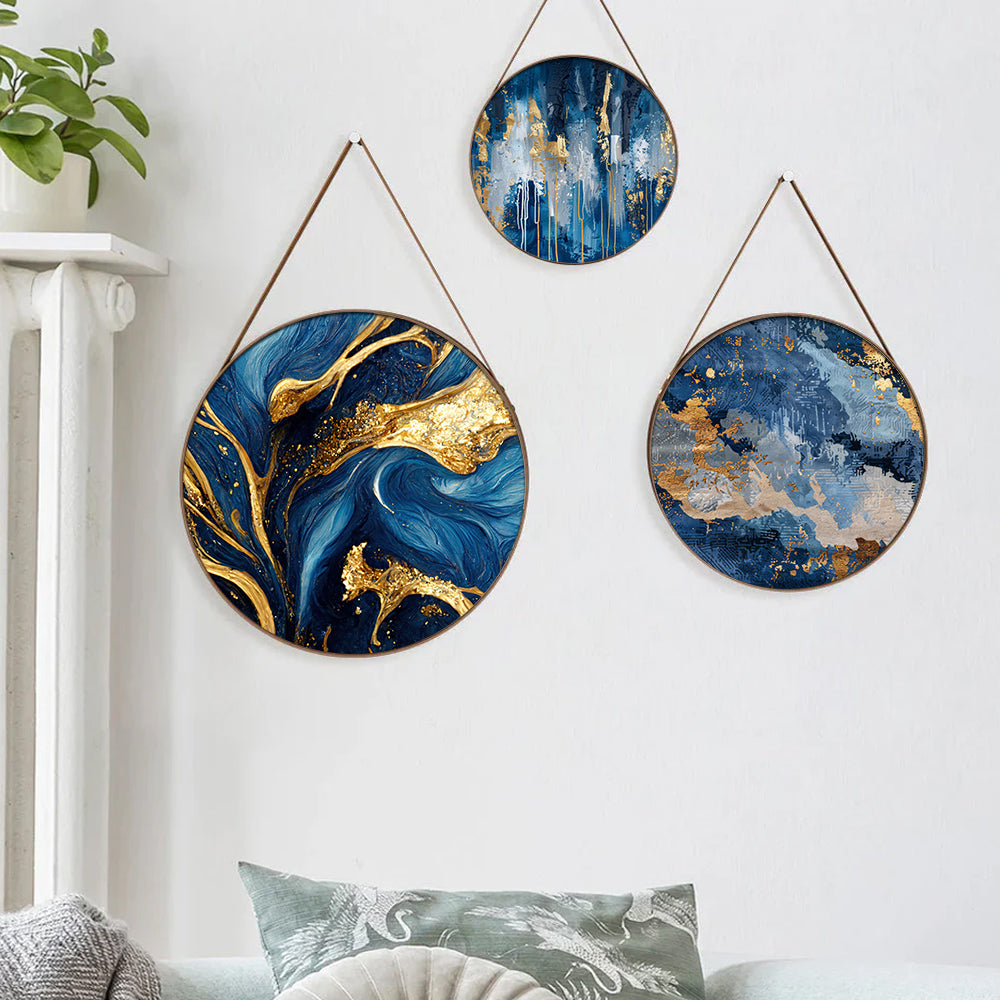 Elegant Abstract Gold & Navy Blue Round Framed Canvas Wall Paintings - Set of 3