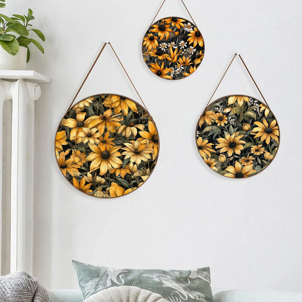 Elegant Circular Yellow Flower Round Framed Canvas Wall Paintings - Set of 3