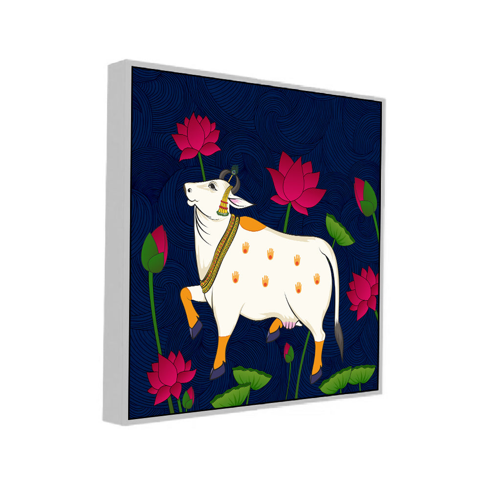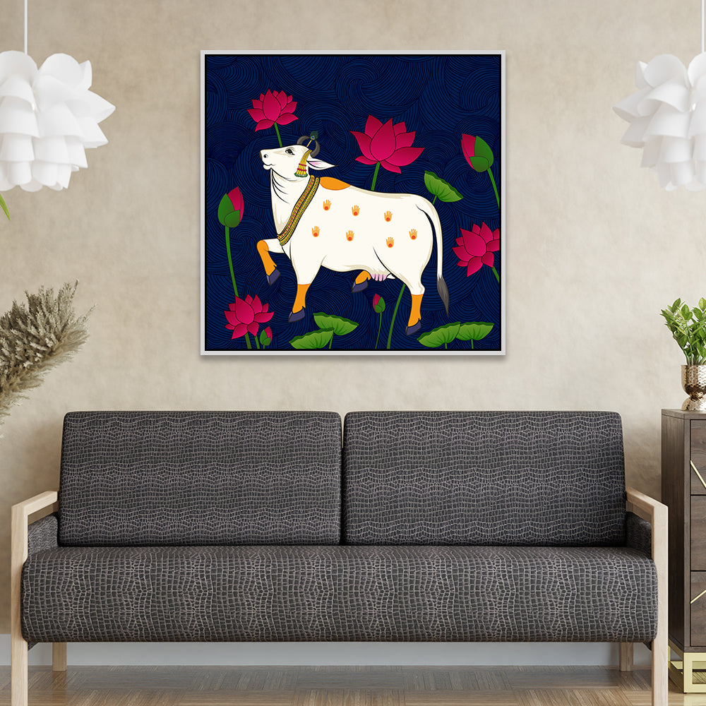 Elegant Pichwai Canvas Painting of Cow with Lotus Flower for Puja Room Décor