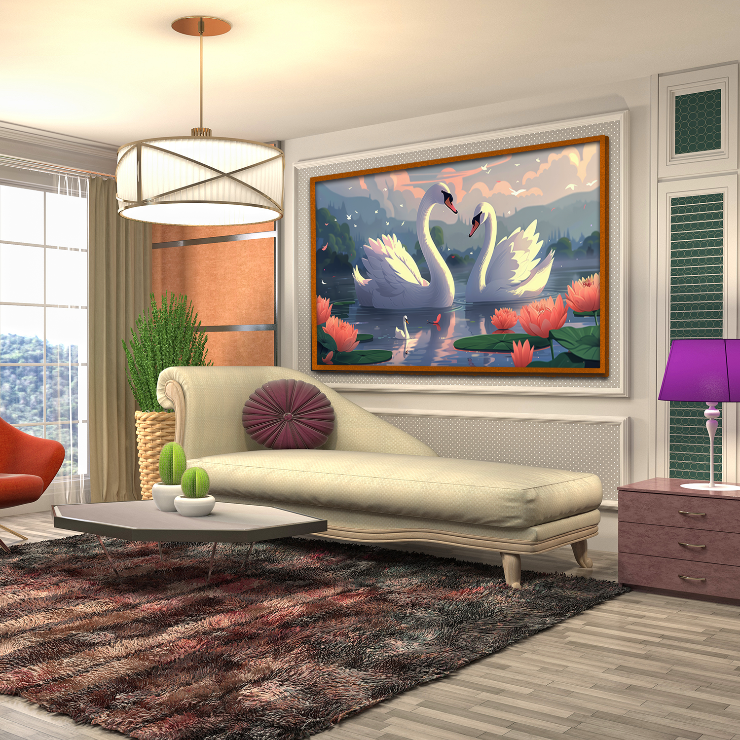 Elegant Swans Birds Serene Lake With Pink Water Lilies Scenic Background Sunset Canvas Printed Wall Paintings