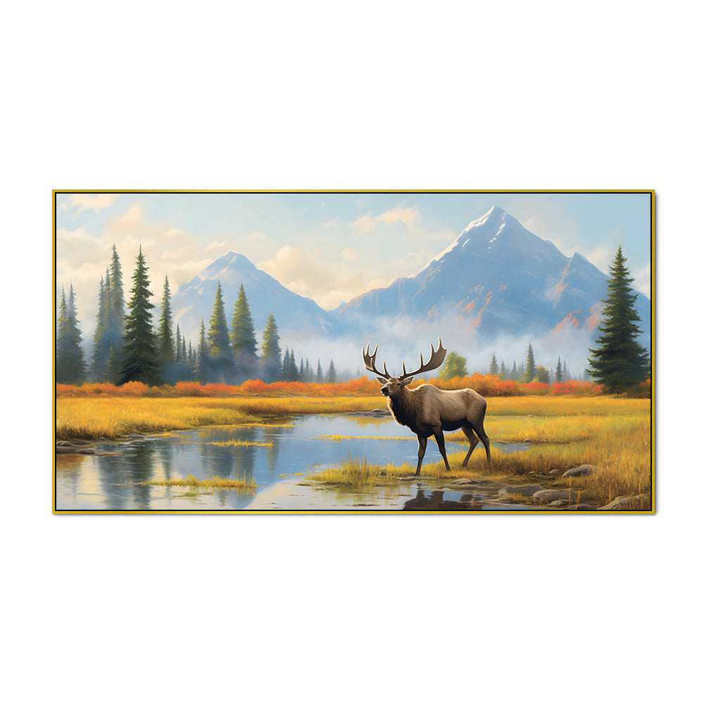 Elk Standing in River Bank with Trees & Mountains Canvas Painting
