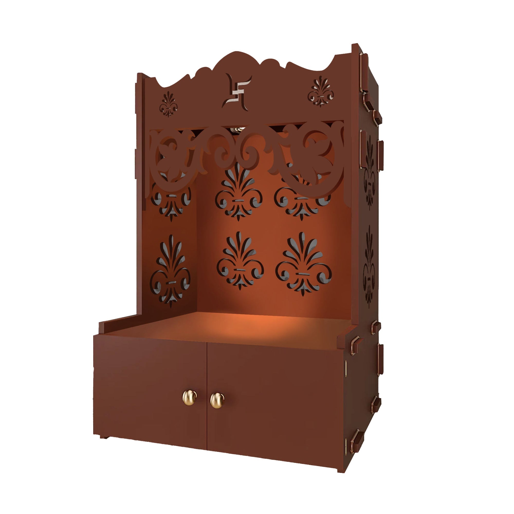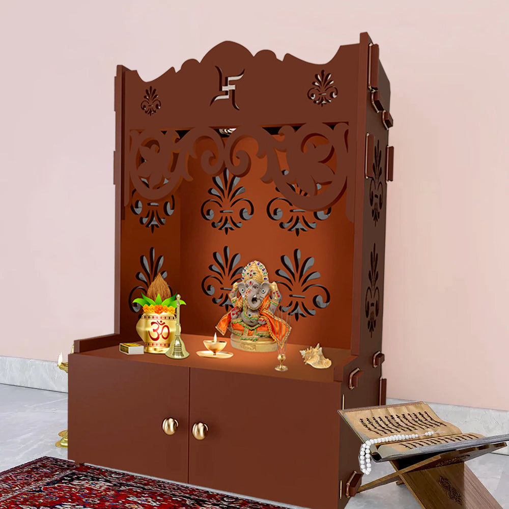 Floral Designer Pattern Floor Temple with Spacious Wooden Shelf & Inbuilt Focus Light- Brown Finish