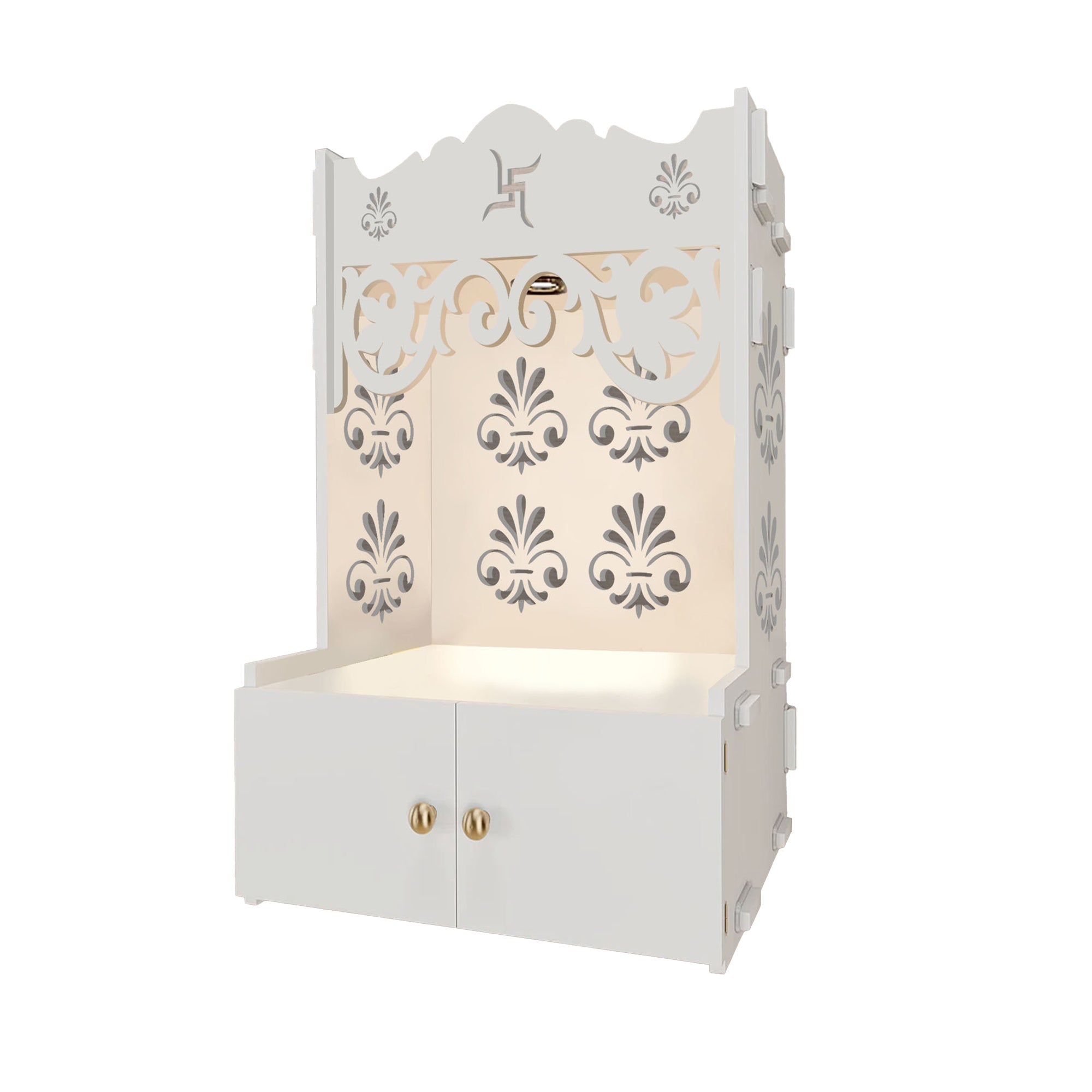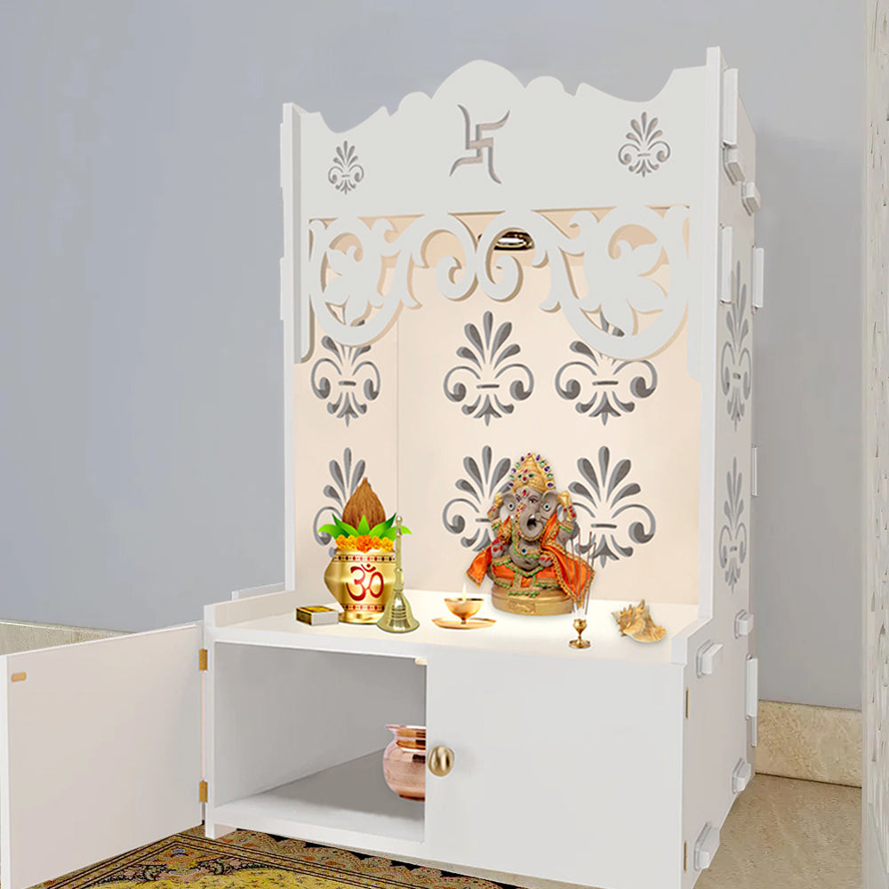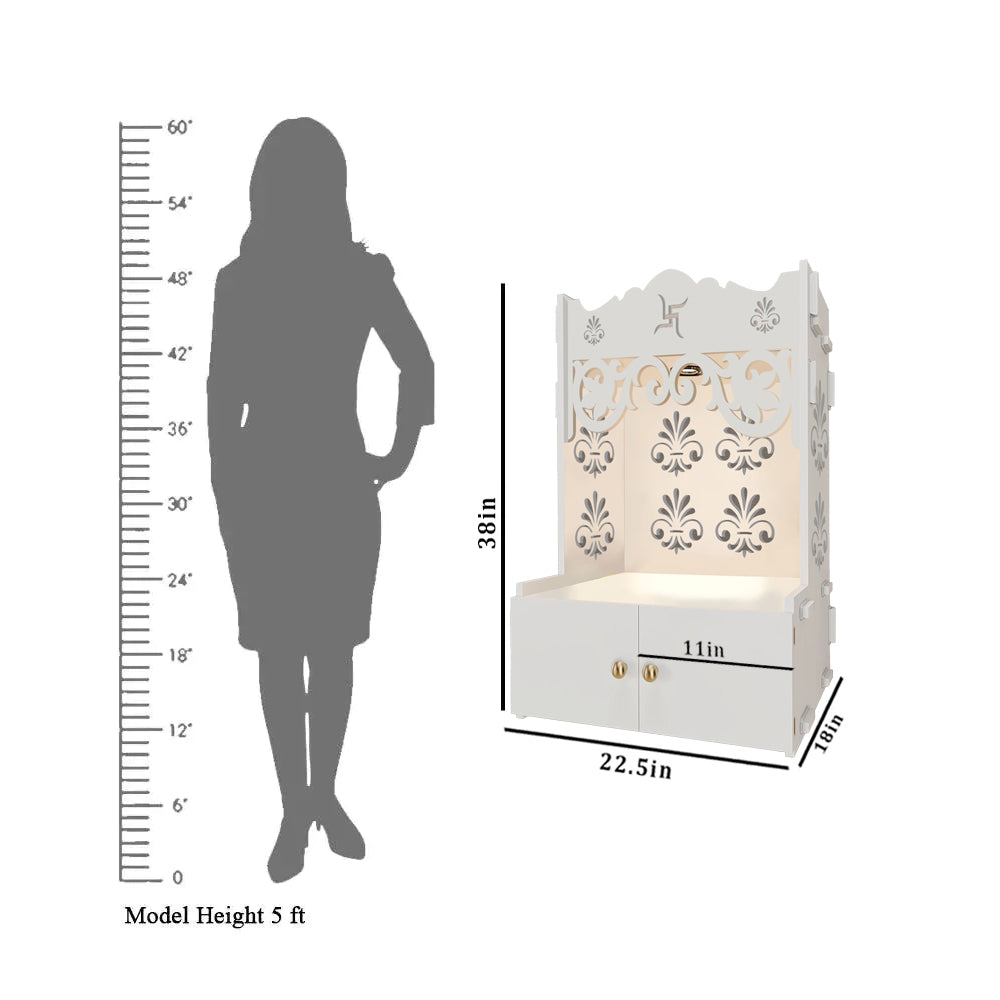 Floral Designer Pattern Floor Temple with Spacious Wooden Shelf & Inbuilt Focus Light- White Finish