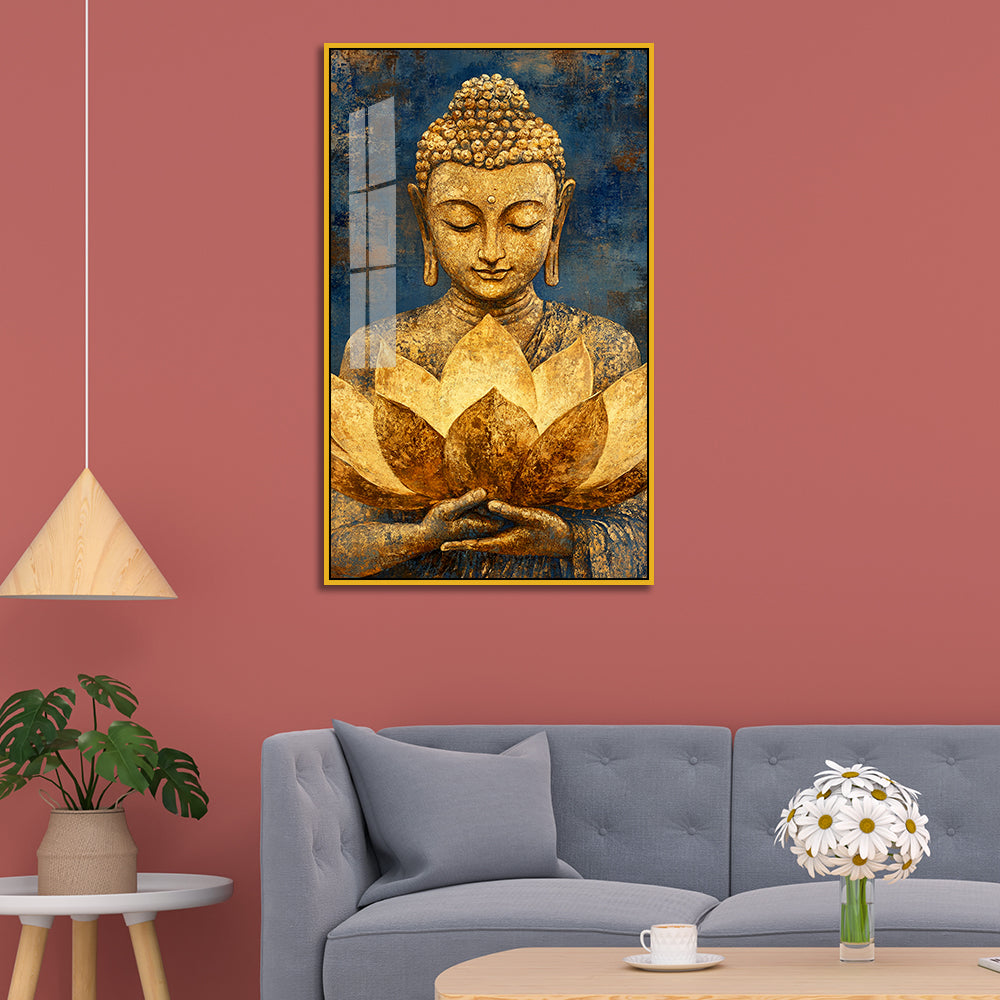 Golden Buddha Acrylic Wall Paintings with Lotus on Blue Background