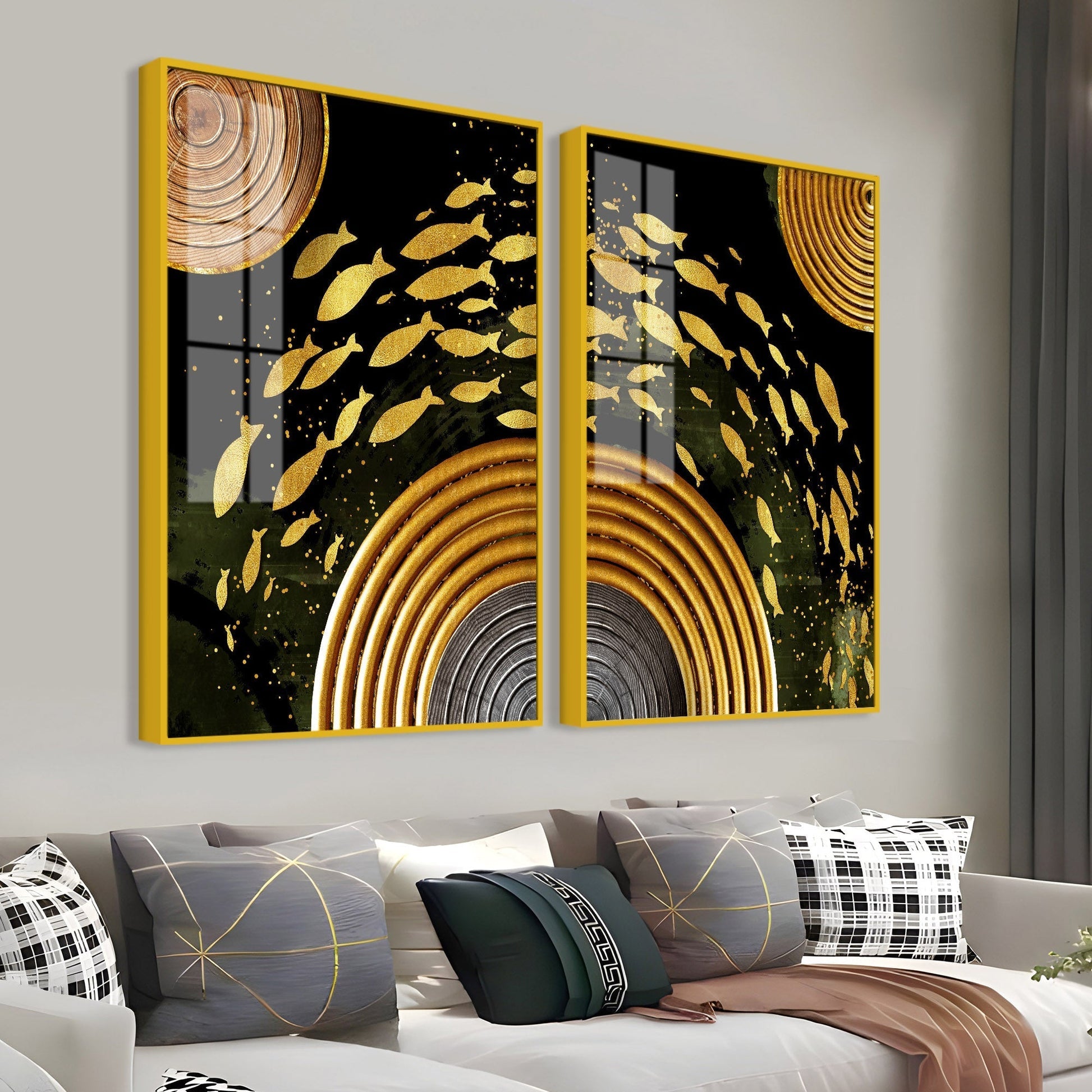Golden Fishes Acrylic Floating Wall Painting Set of 2