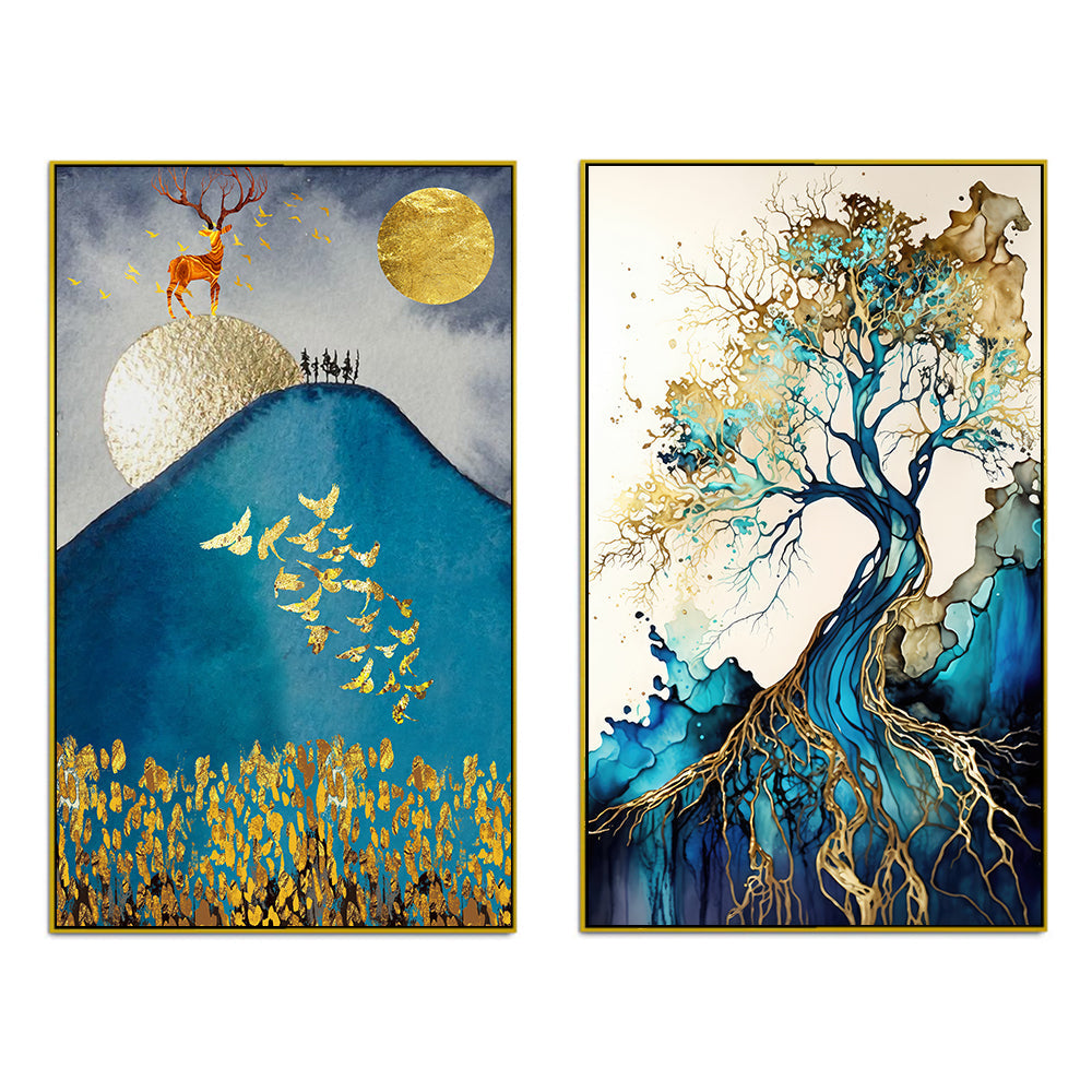 Golden Tree and Deer Modern Canvas Wall Painting Two Pieces