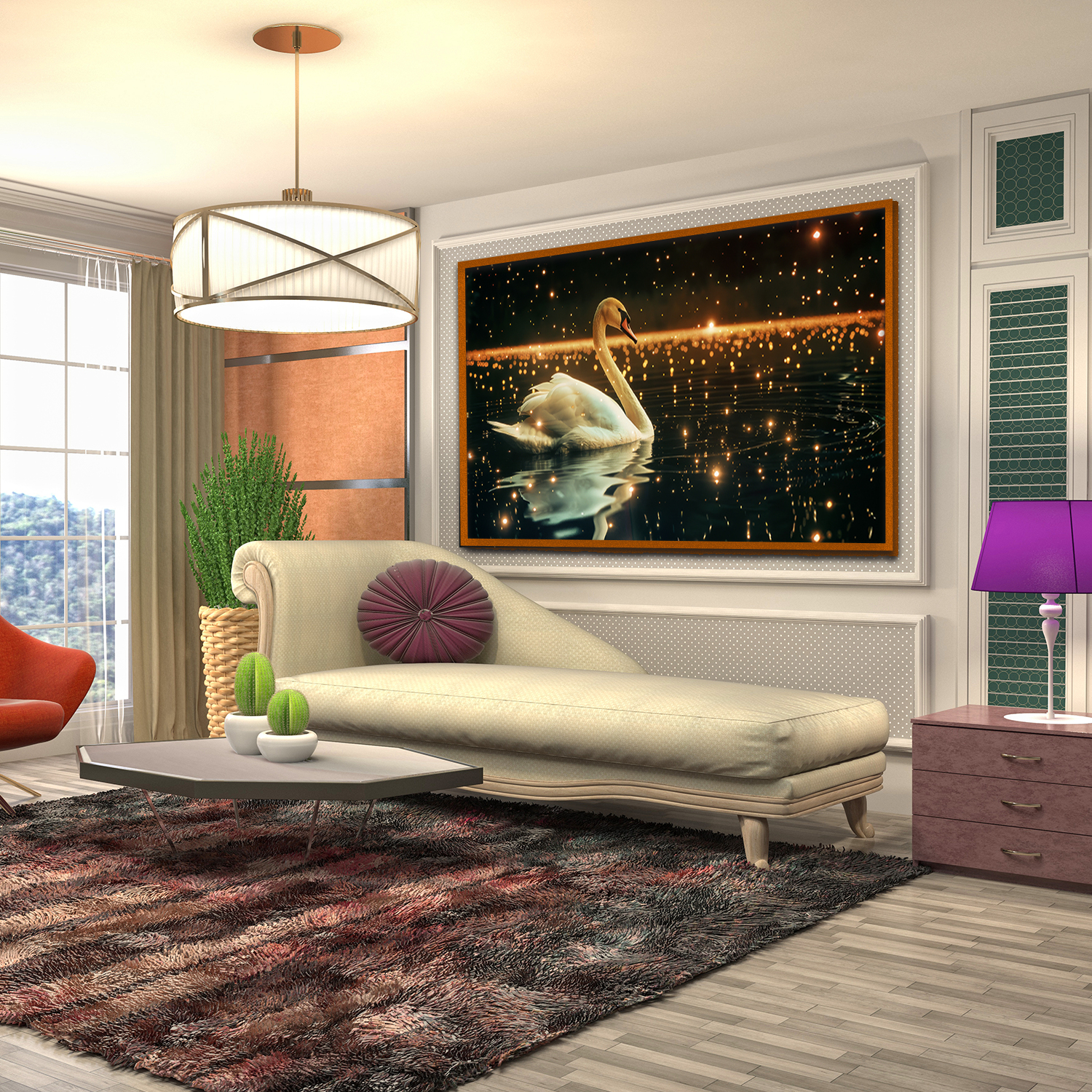Graceful Swan Serene Lake Surrounded By Whimsical Sparkling Lights Nighttime Canvas Wall Paintings