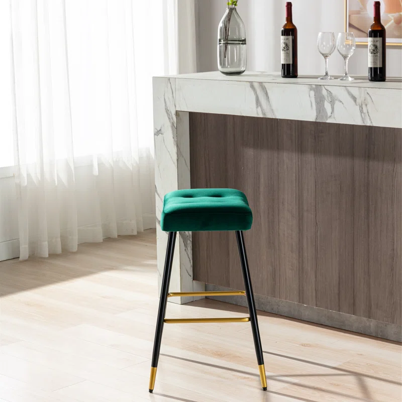 About the Product:This bar stool has clean lines and velvet upholstery that offer your kitchen island or dining table a glam look. The frames are made from engineered wood and metal, and built on flared legs for a contemporary artist look in your space. These foam-filled stools feature a bucket seat with a curved back, and they're upholstered in velvet in your choice of color. Also, they have built-in support bars at the bottom to keep your feet comfy while you kick back and enjoy a good meal or a glass of wine with friends. We also love that these stools are stain and rust-resistant, so they stand up to spill and ding.