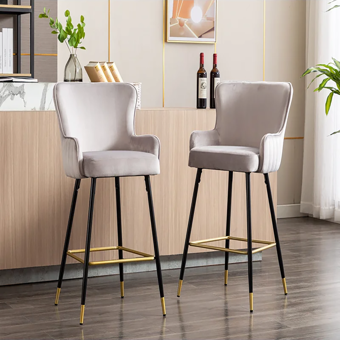 About the Product:This bar stool has clean lines and velvet upholstery that offer your kitchen island or dining table a glam look. The frames are made from engineered wood and metal, and built on flared legs for a contemporary artist look in your space. These foam-filled stools feature a bucket seat with a curved back, and they're upholstered in velvet in your choice of color. Also, they have built-in support bars at the bottom to keep your feet comfy while you kick back and enjoy a good meal or a glass of wine with friends. We also love that these stools are stain and rust-resistant, so they stand up to spill and ding.