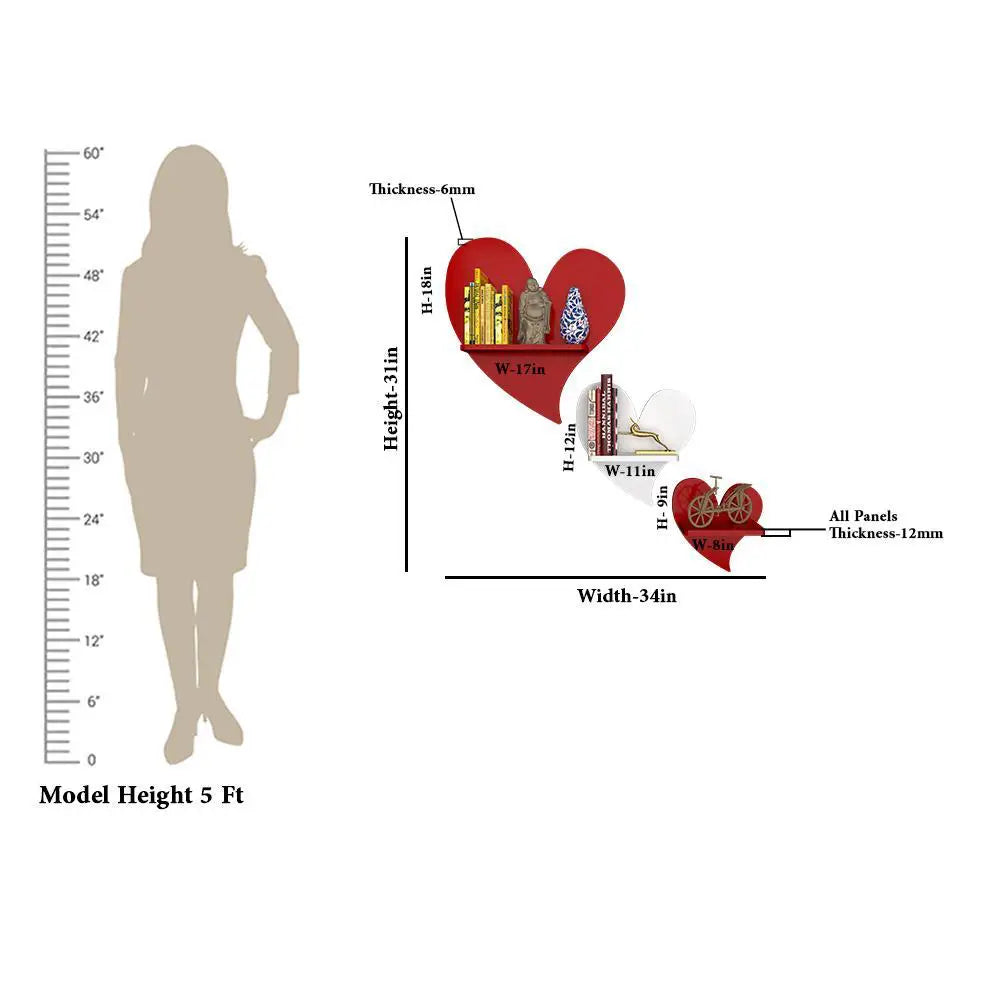 Heart Shape Wood Wall Shelf / Book Shelf, Red and White Color