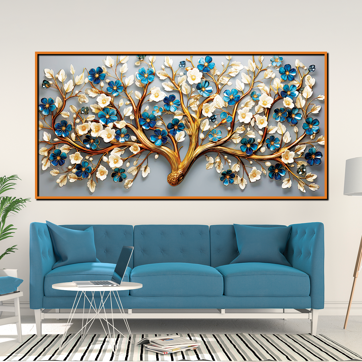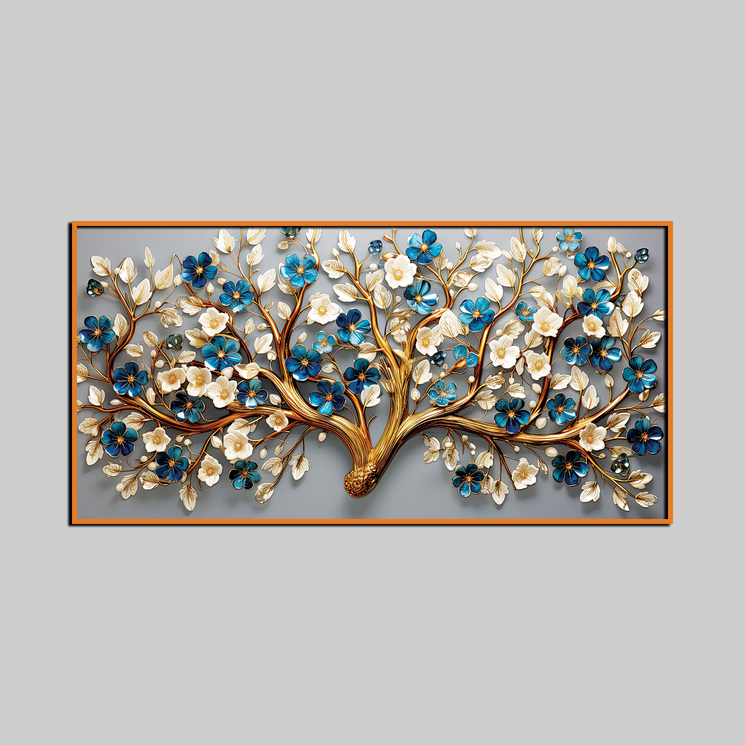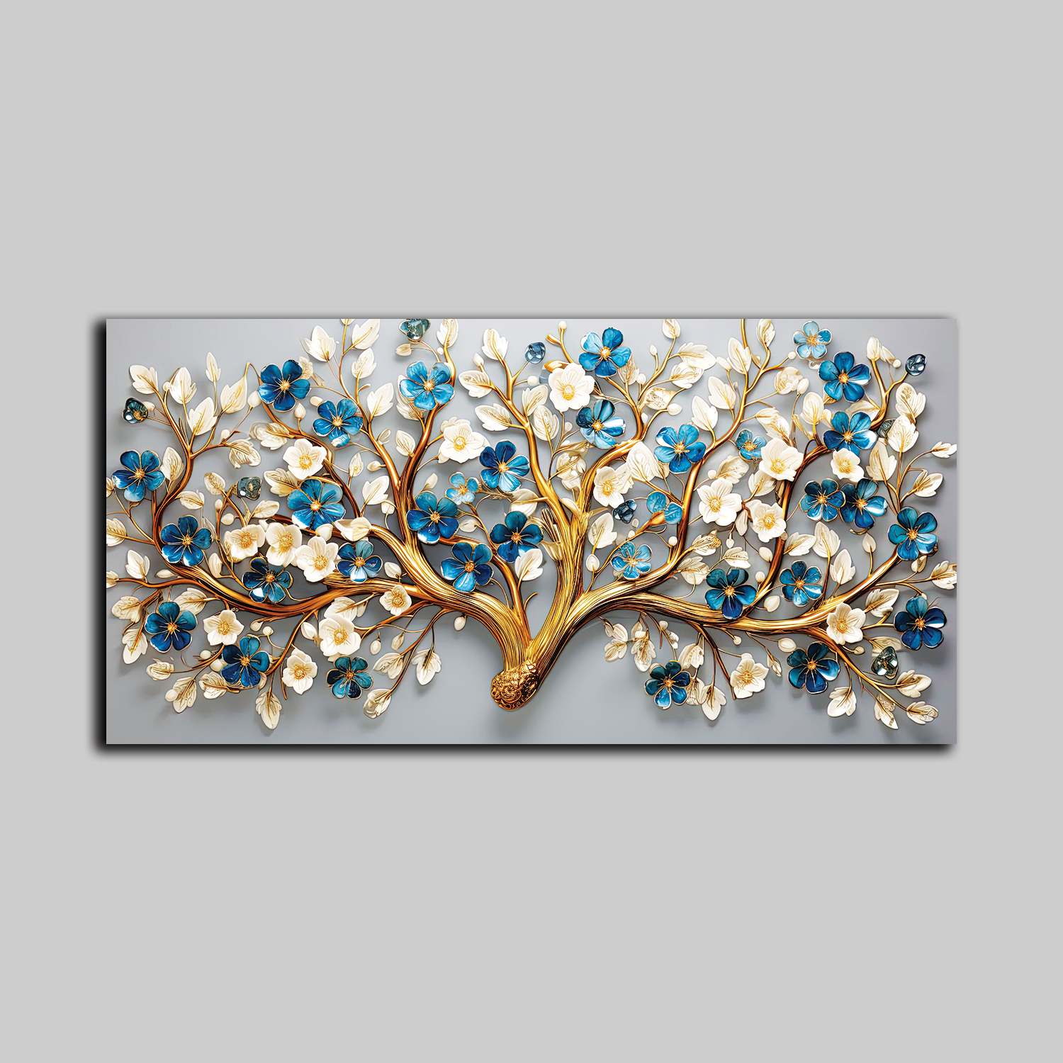 Luxury 3D Blooming Tree Wall Art – Gold Trunk with Blue and White Flowers on Grey Canvas