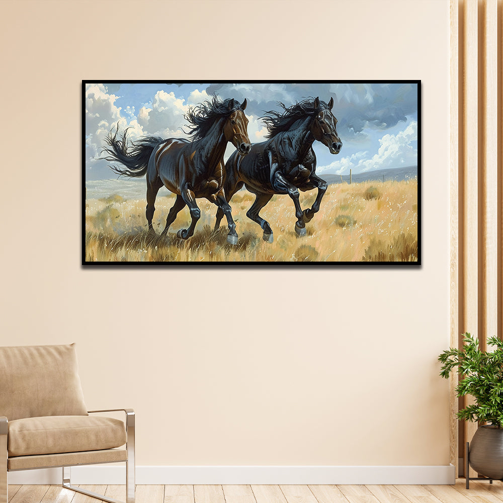 Majestic 2 Black Running Horses Canvas Wall Painting