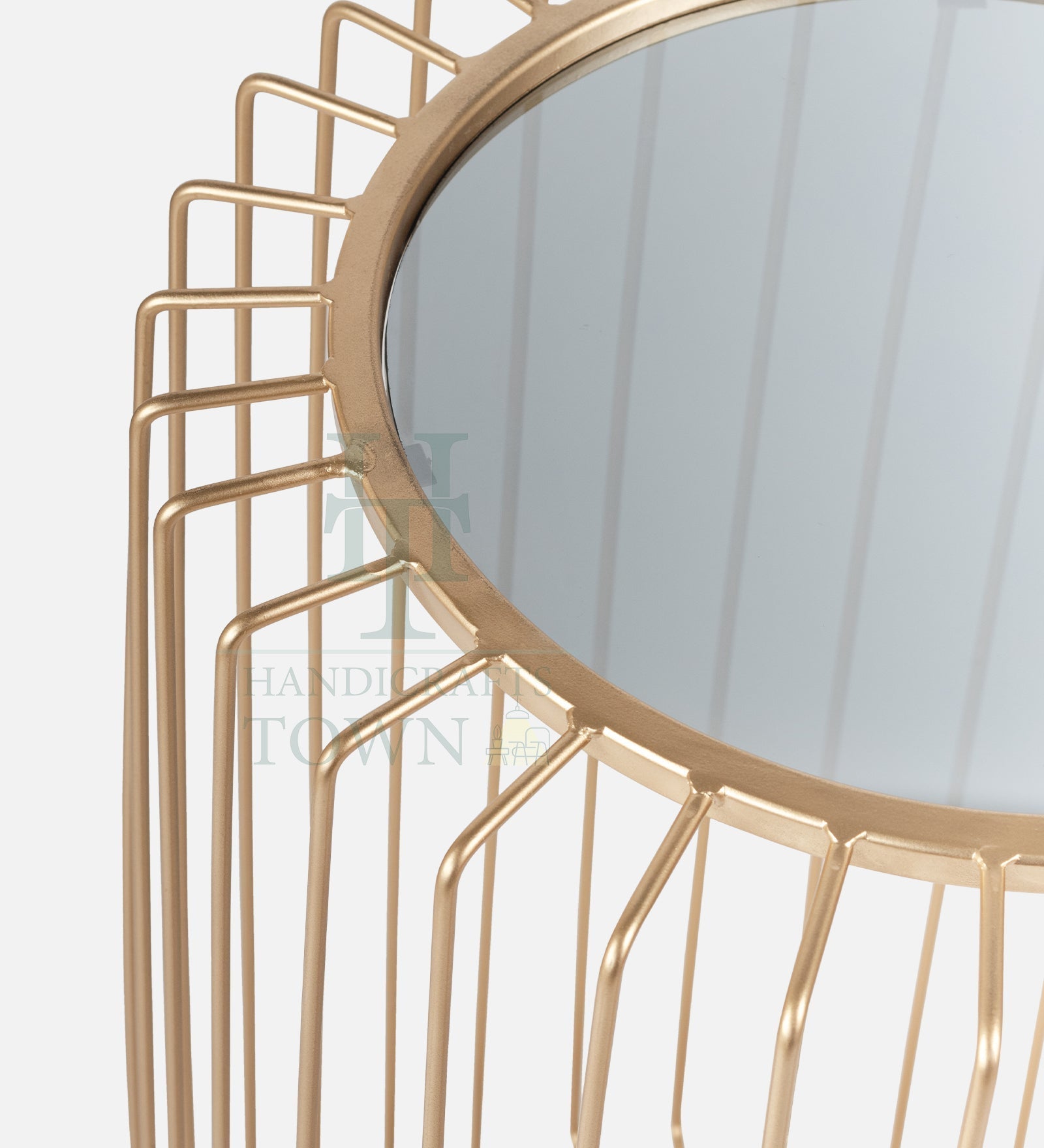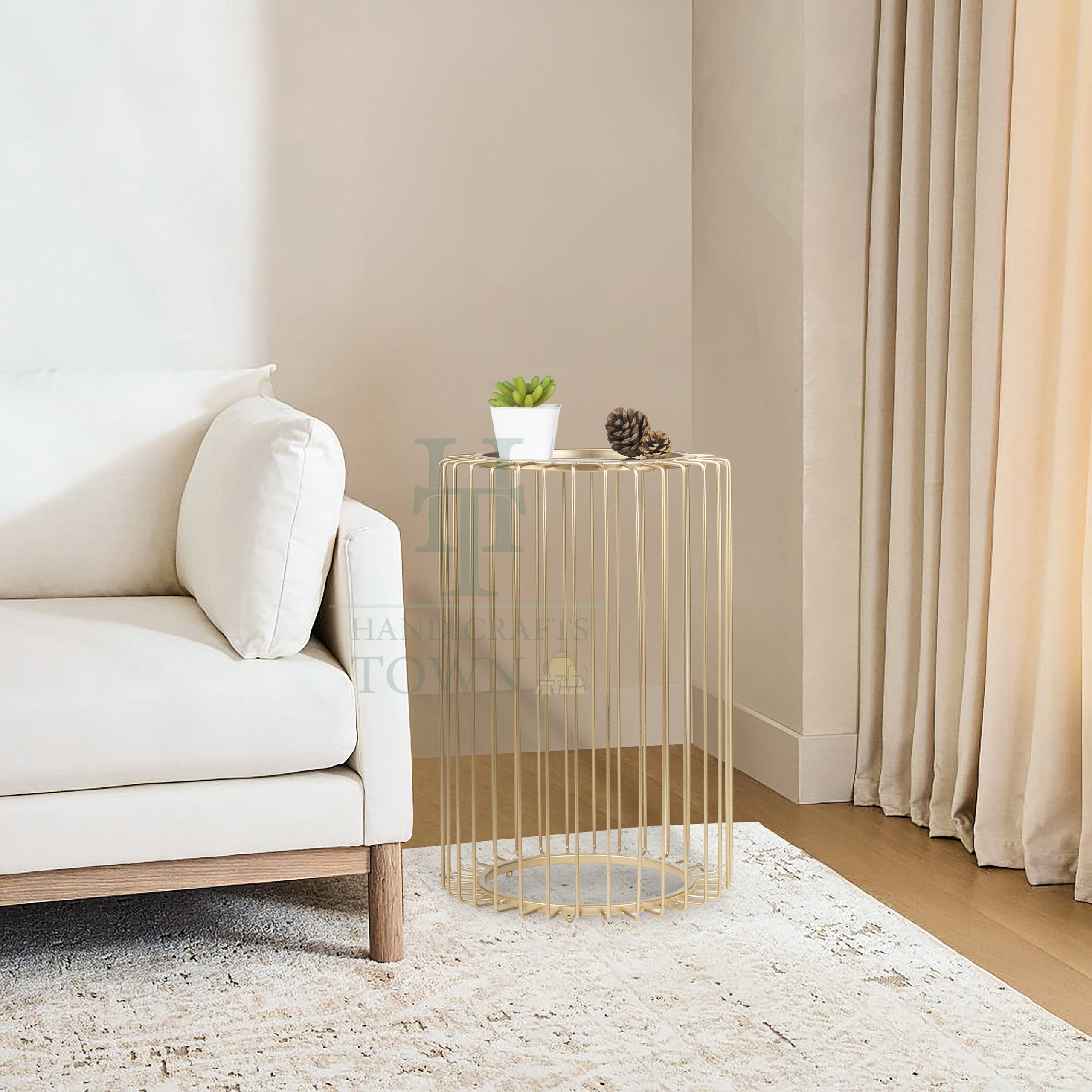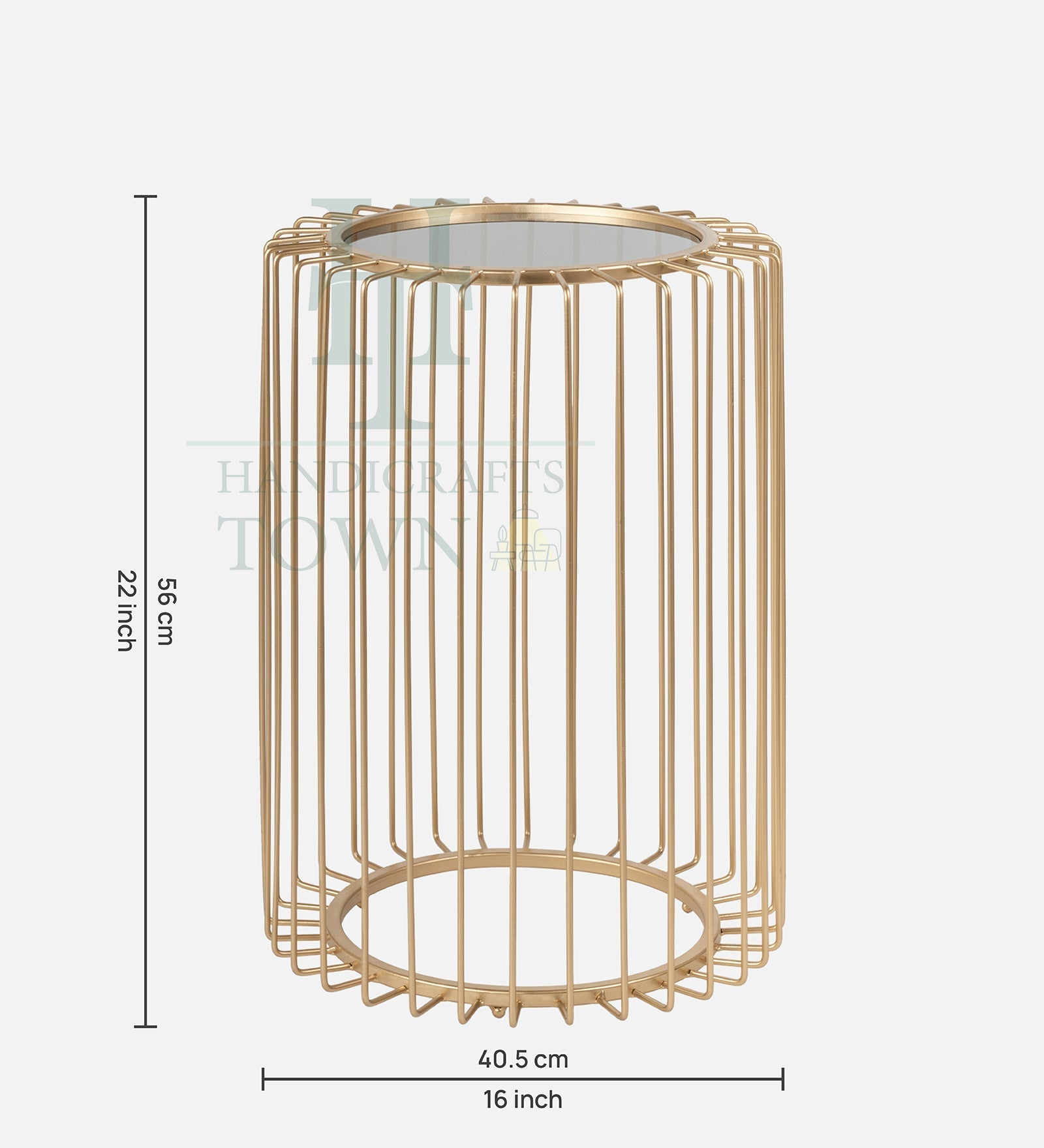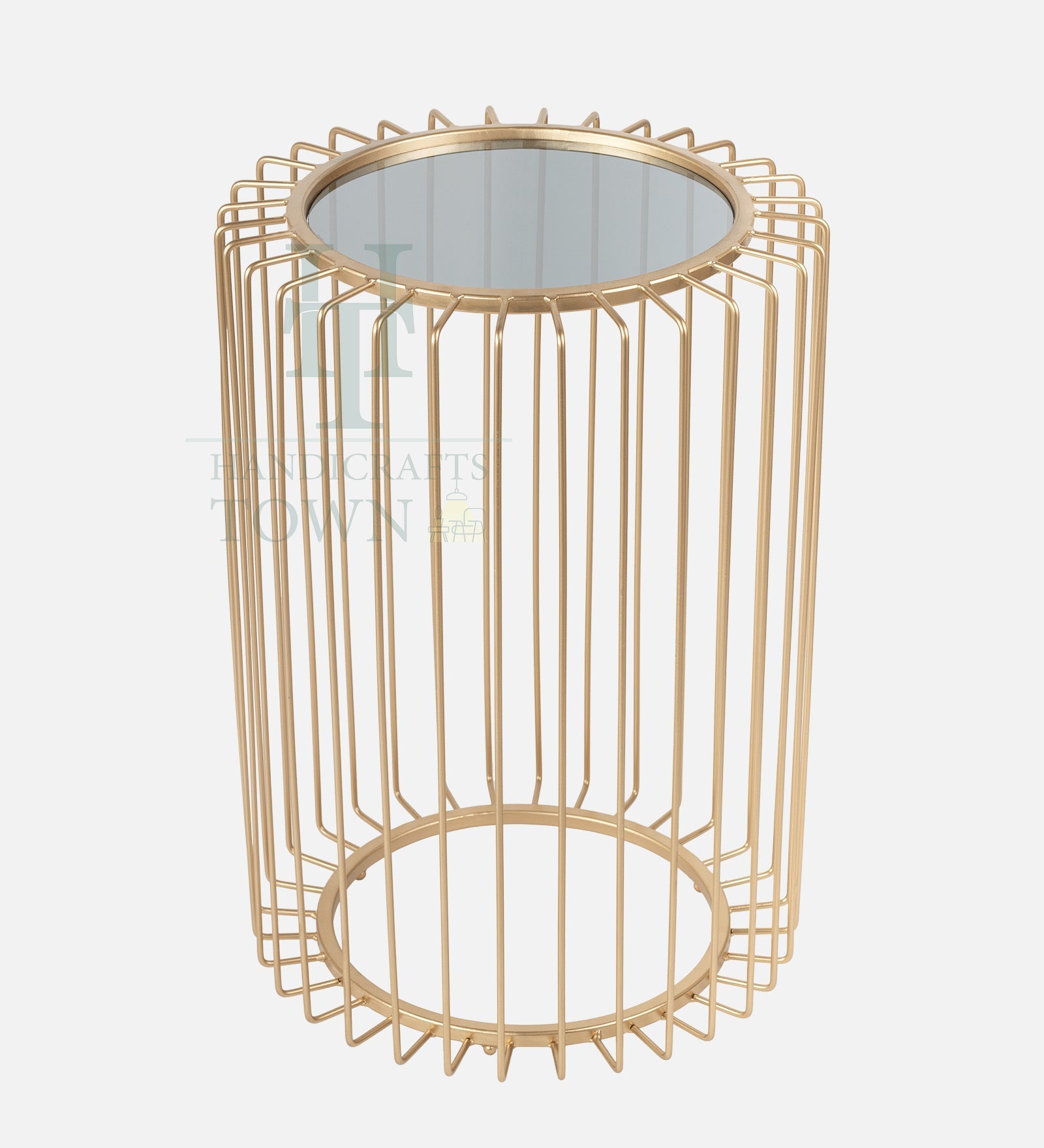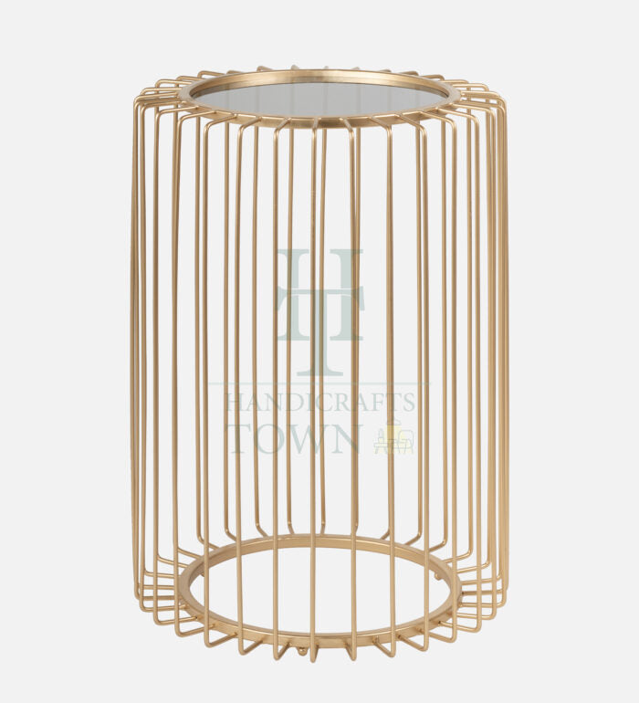 A metal cage side table with a glass top is a type of furniture that combines functionality and style. It features a metal cage base in Gold which provides an open and airy design, while the glass top provides a smooth and elegant surface. The metal cage base is typically made of metal iron, and features a cage-like design that gives the table an industrial or modern feel. The gold finish applied to the metal is usually a powder and lacquer coating, which provides a durable surface. The cage design not only adds to the overall aesthetic of the table, but also provides stability and support for the glass top. The glass top of the table is usually made of glass, which is a type of glass that has been treated to make it stronger and more durable. The glass top provides a smooth and transparent surface that complements the metal cage base, and allows the contents of the table to be seen from above.