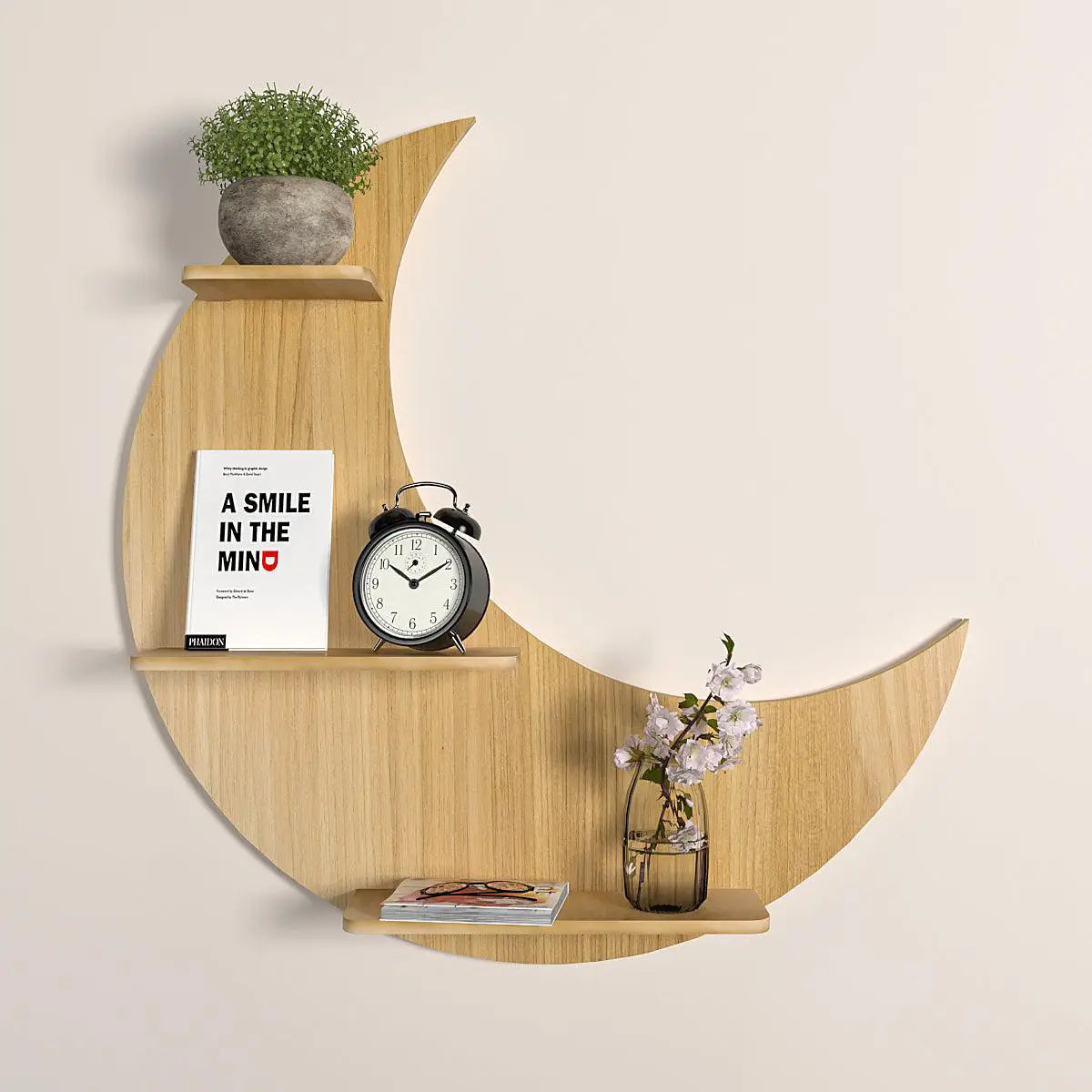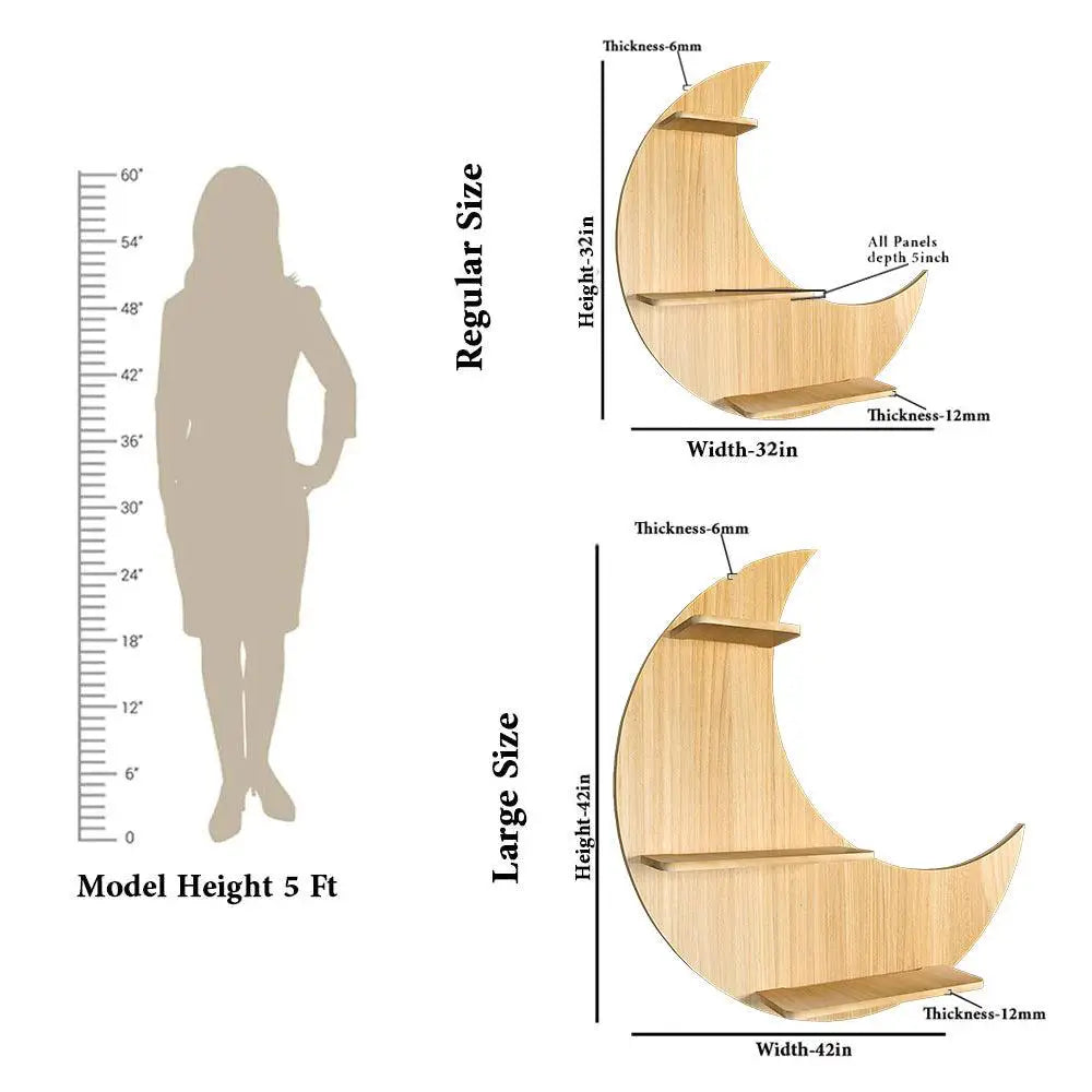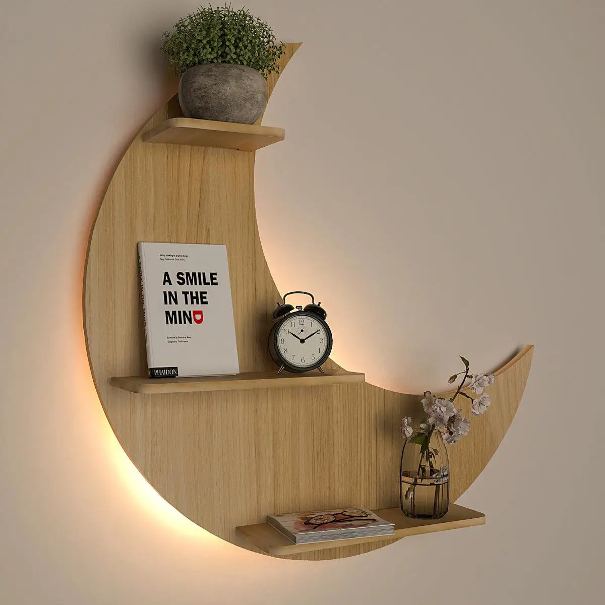 Moon Backlit Wood Wall Shelf / Book Shelf, Oak Finish
