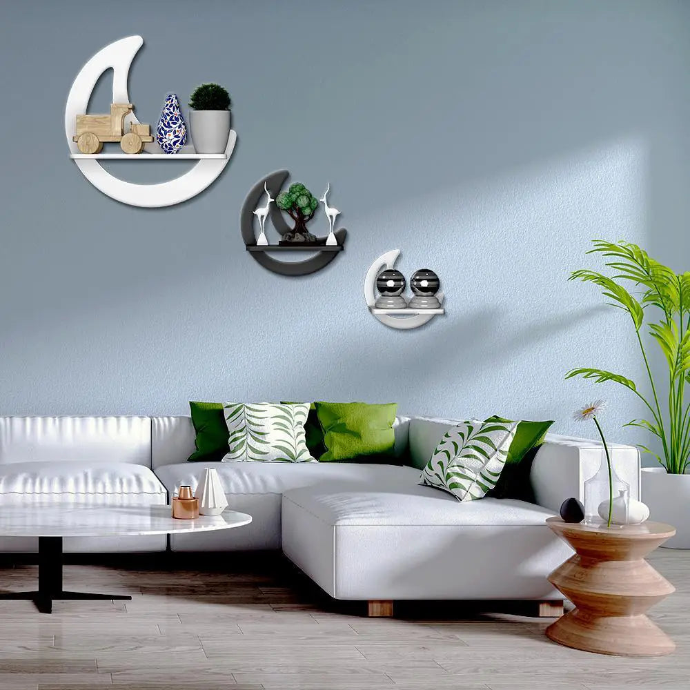 Moon Shape Set of 3 Wood Wall Shelf / Book Shelf, White & Grey