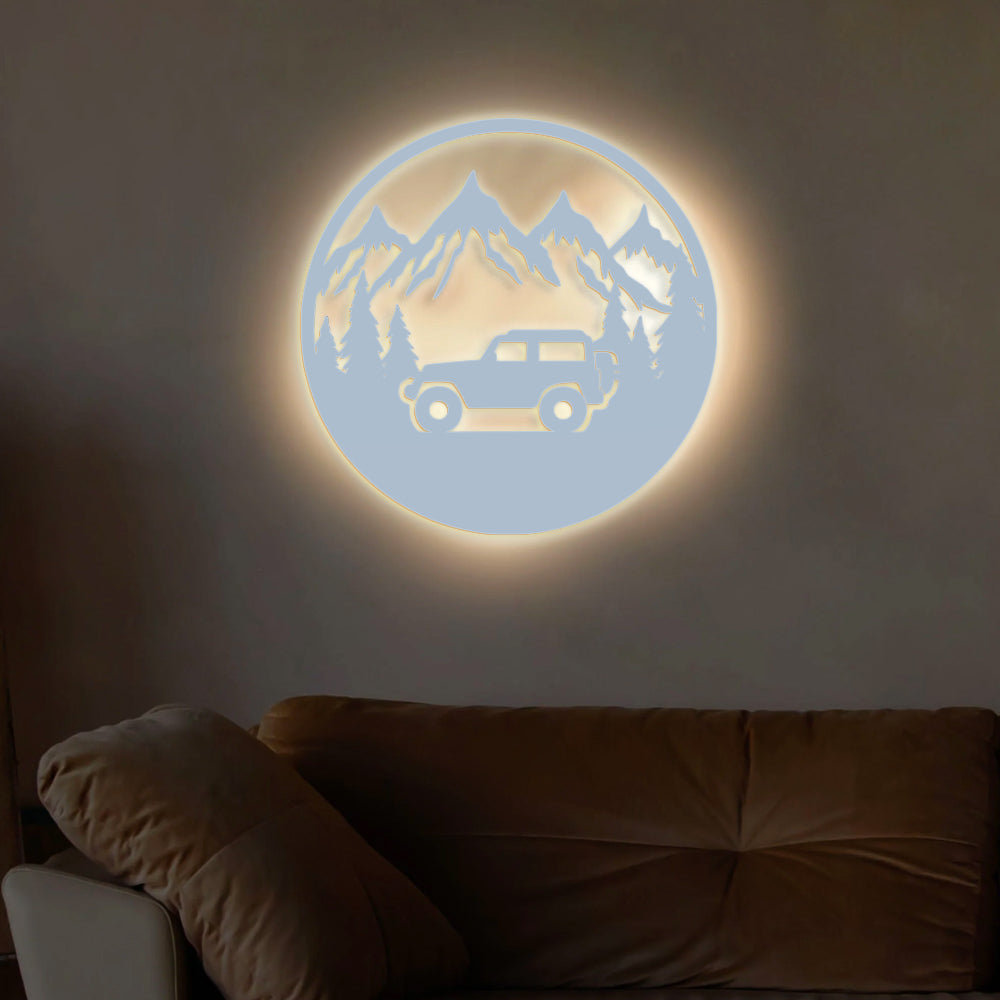 Mountain Forest Road Jeep Art Backlit Wooden Wall Hanging with LED Night Light Walnut Finish