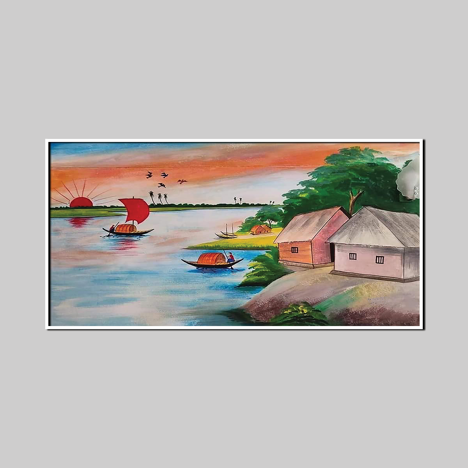 Natural Scenery Drawing of a Riverside Village at Sunset