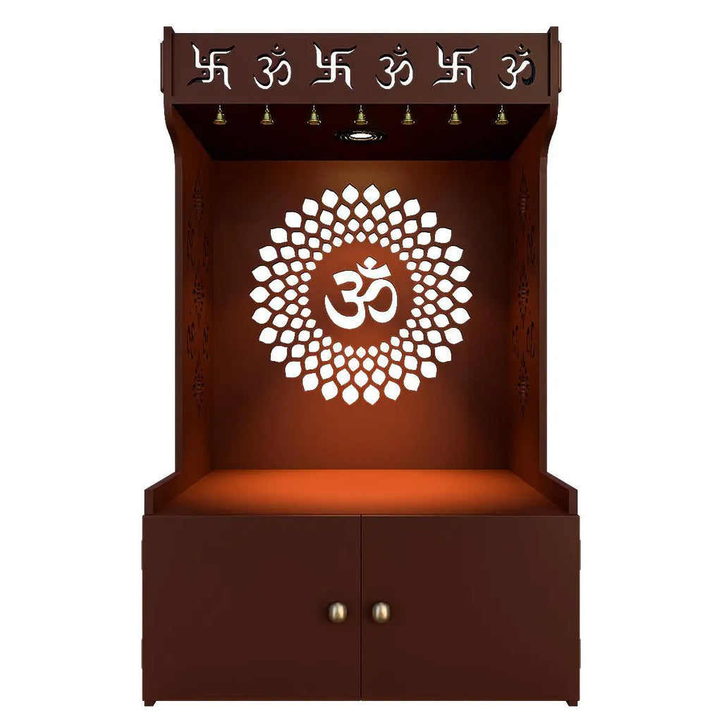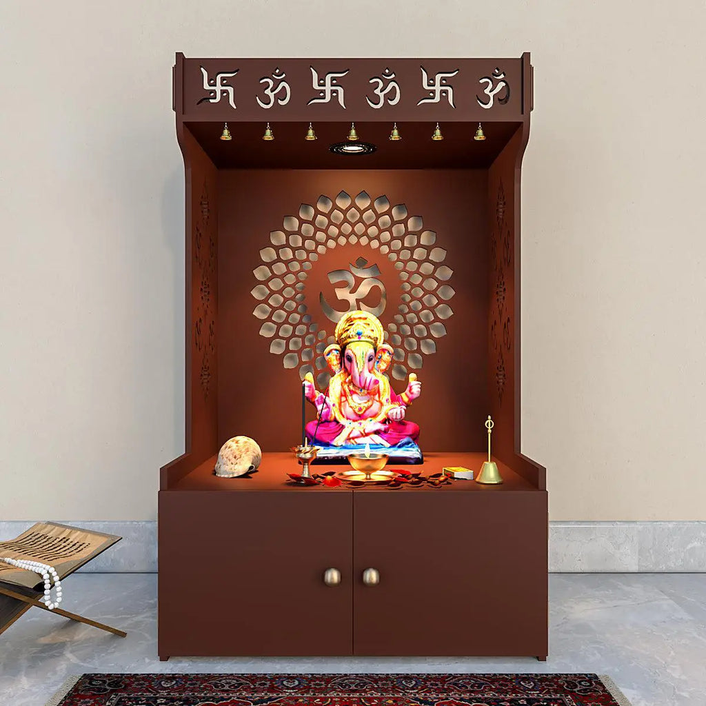 Om Chakra Floor Temple with Spacious Wooden Shelf & Inbuilt Focus Light- Brown