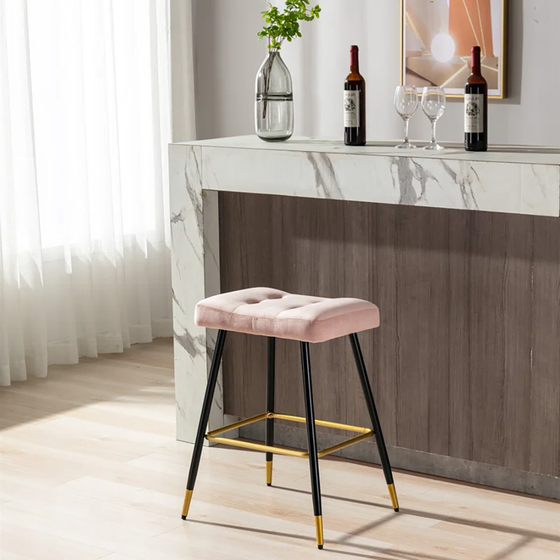 About the Product:This bar stool has clean lines and velvet upholstery that offer your kitchen island or dining table a glam look. The frames are made from engineered wood and metal, and built on flared legs for a contemporary artist look in your space. These foam-filled stools feature a bucket seat with a curved back, and they're upholstered in velvet in your choice of color. Also, they have built-in support bars at the bottom to keep your feet comfy while you kick back and enjoy a good meal or a glass of wine with friends. We also love that these stools are stain and rust-resistant, so they stand up to spill and ding.