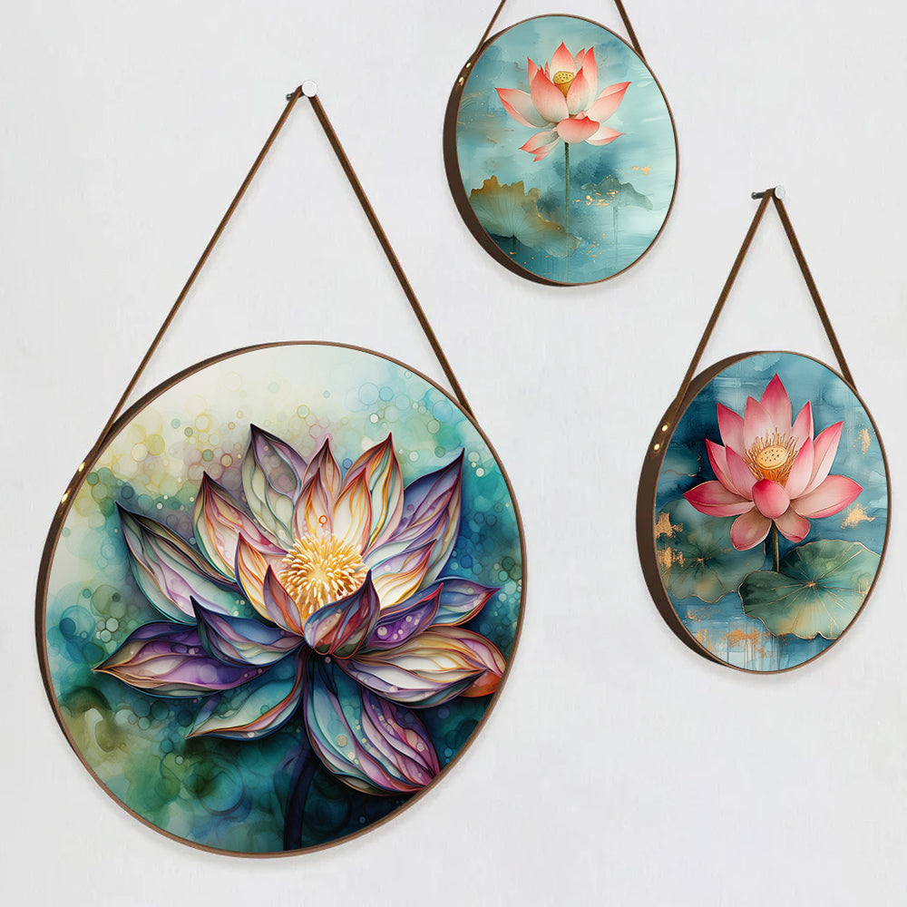 Purple and Pink Lotus Floral Round Framed Vastu Canvas Wall Paintings - Set of 3