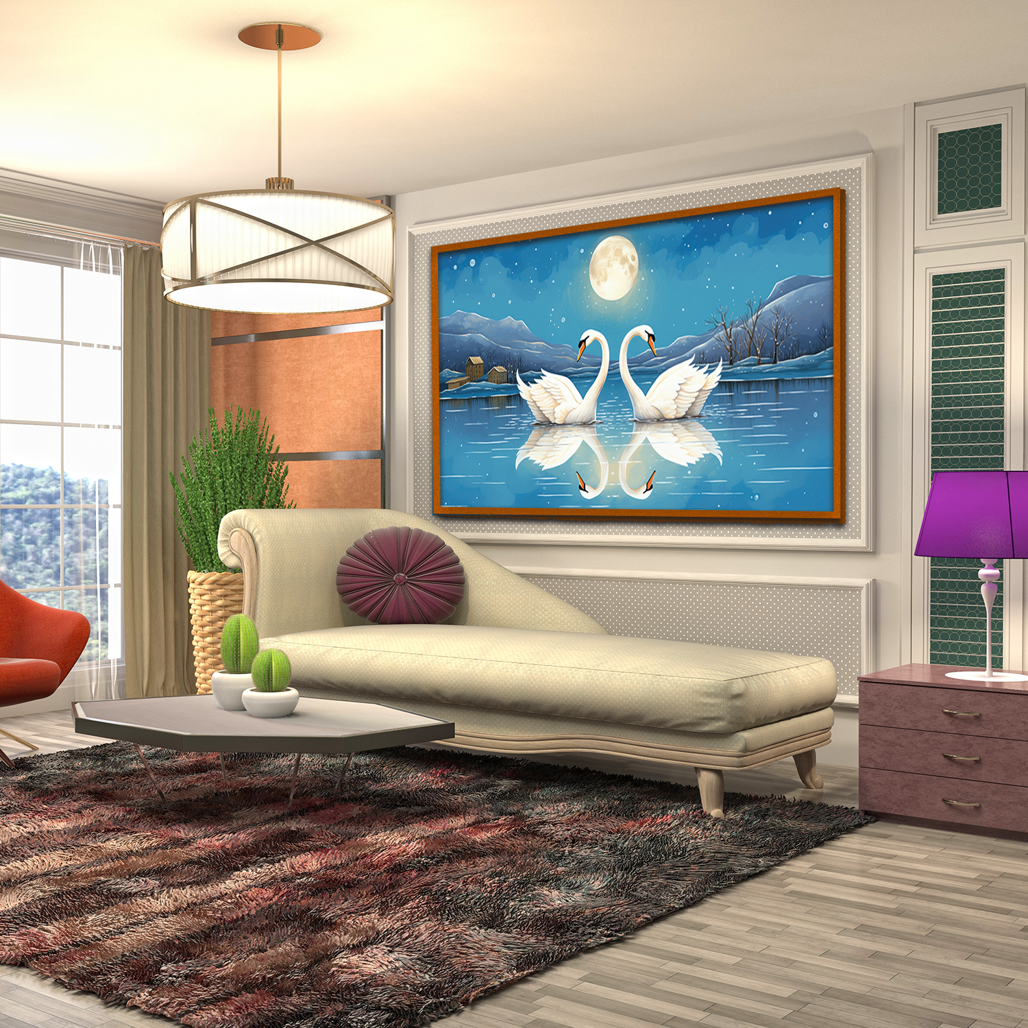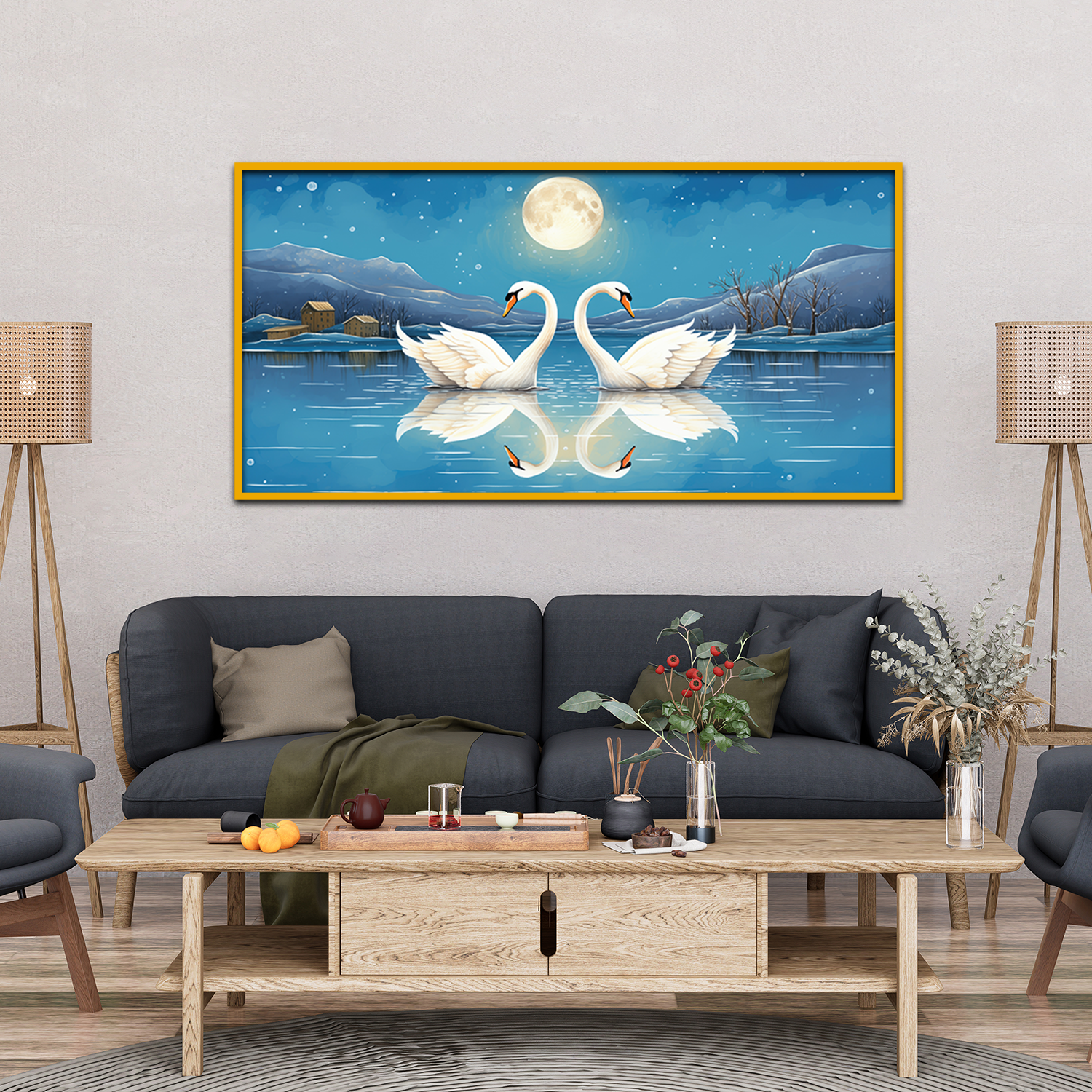 Realistic Pair Swans Birds Lakes Ice Edge Moon Glistening Canvas Wall Paintings