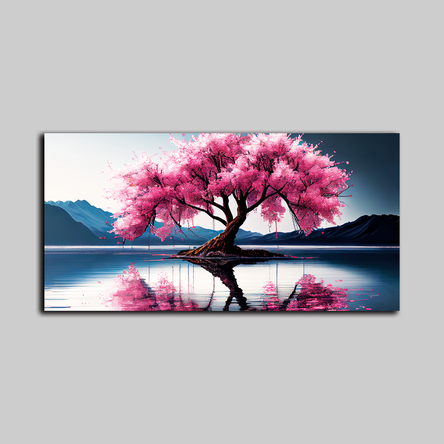 Serene Pink Blossom Tree Wall Art – Cherry Tree on Water with Mountain Reflections