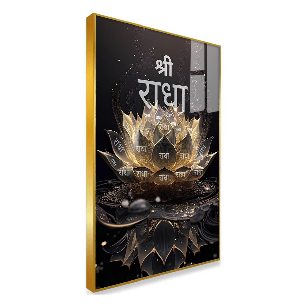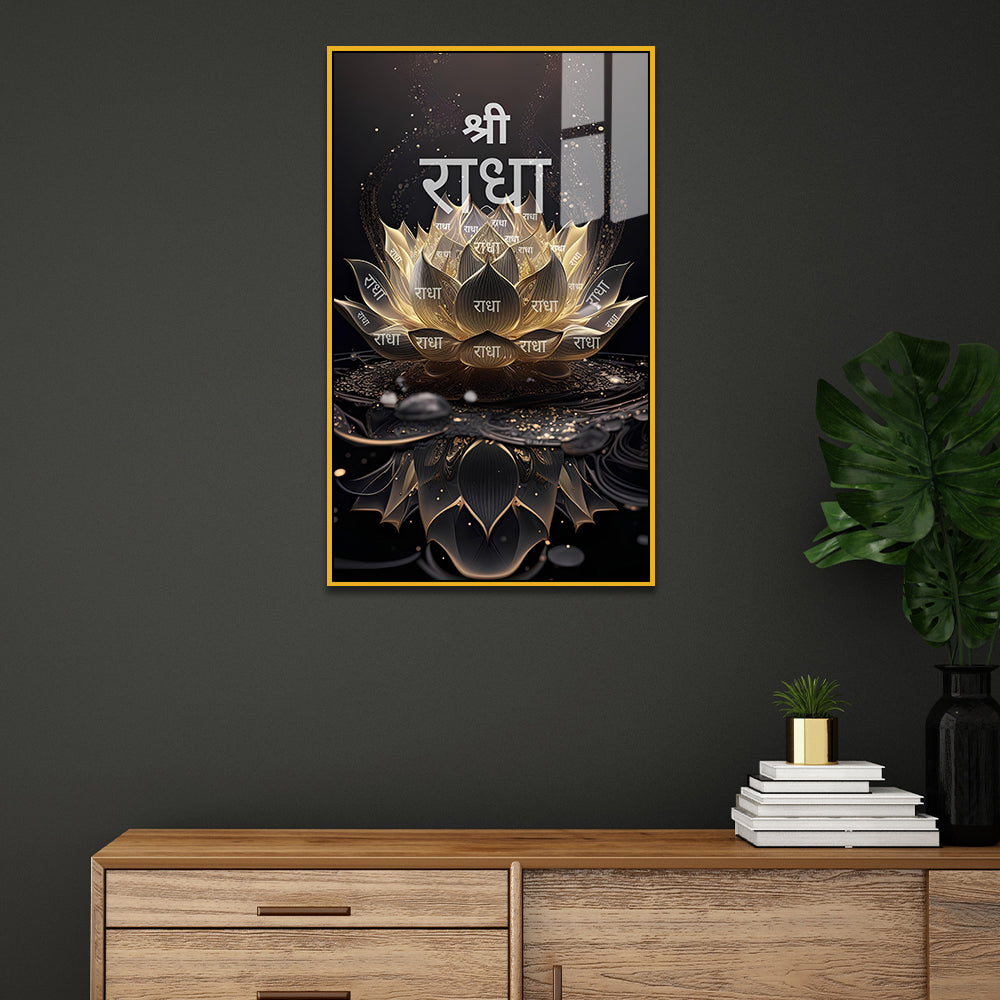 Shri Radha Lotus Wall Art – Divine Name on Golden Lotus Canvas for Spiritual Home Décor