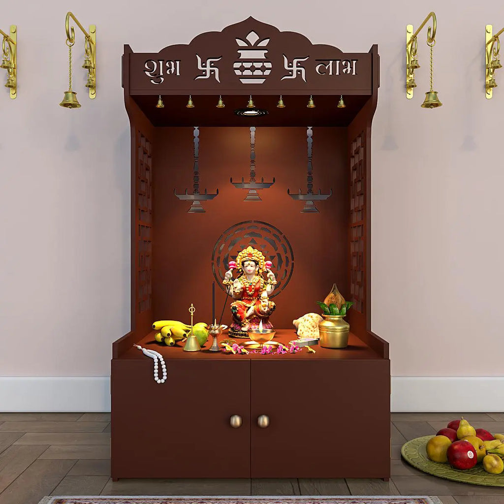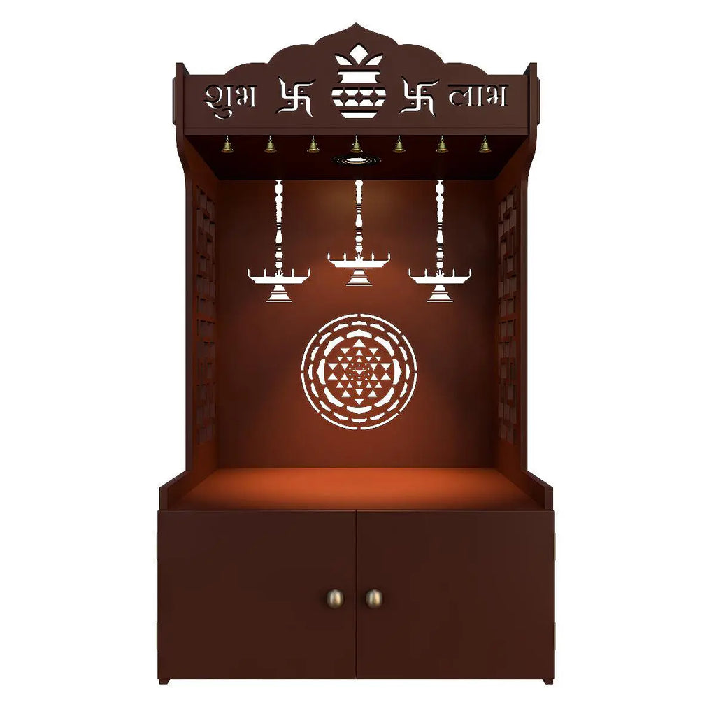 Timeless Wooden Mandir for Home with Spacious Shelf & Inbuilt Focus Light- Brown