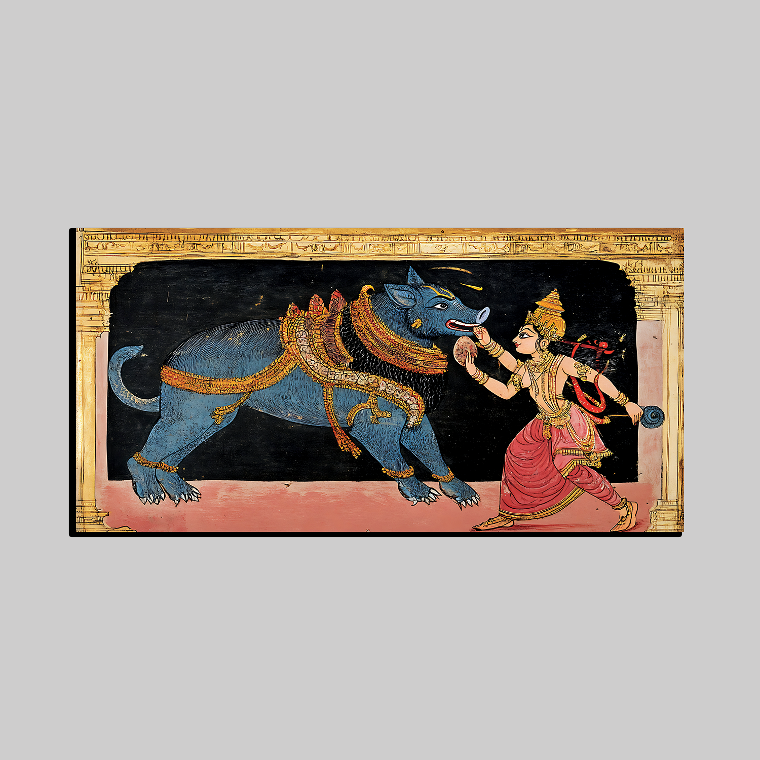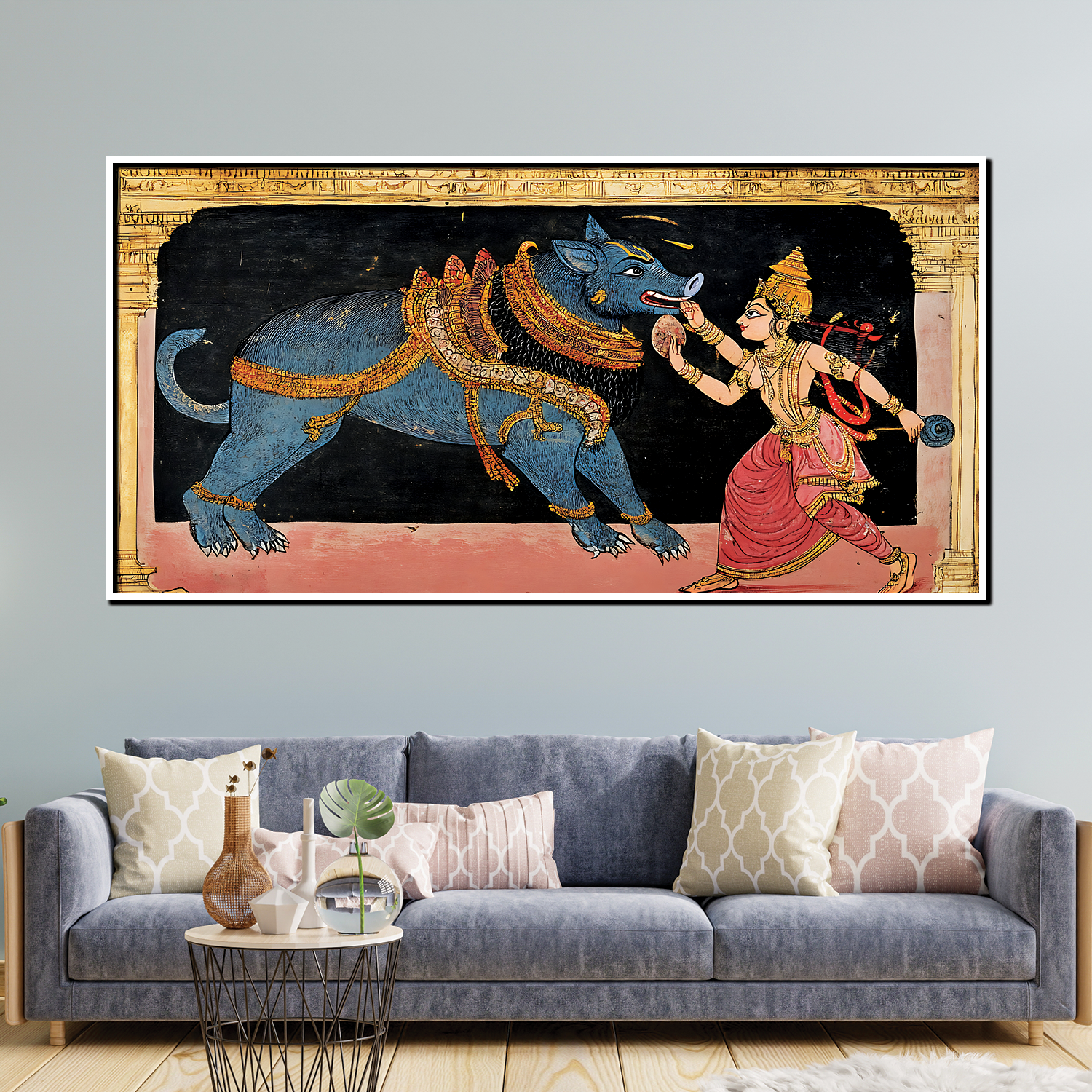 Traditional Indian Mythological Wall Art – Goddess Slaying Demon in Pattachitra-Style Painting